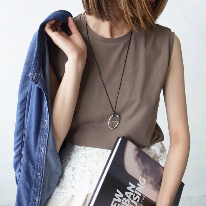 シーズンレスで着まわしの効くベーシックなスリーブレスコットンプルオーバー。 適度にハリ感があるので、身体にフィットしすぎず、一枚でもキャミワンピースのインナーにも使える万能アイテムです。 表側は撥水加工、裏側は吸水速乾加工を施しているので、汗が表ににじみにくいのも嬉しいポイント◎