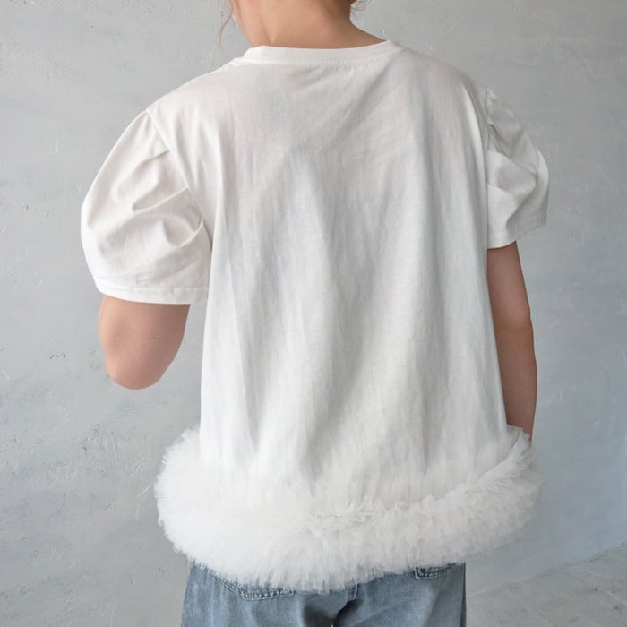 立体的なデザインのあるお袖と裾のボリュームチュールが目を惹くプルオーバー。