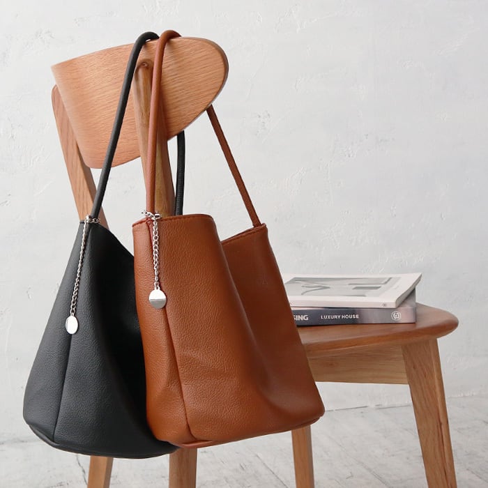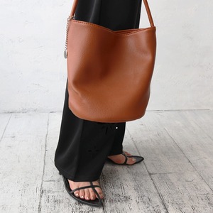 柔らかなフェイクレザーを使用しており手触りも良く、シボ加工が高見えするアイテムです。 丸みのあるバケツ型のフォルムで、収納力抜群◎ バッグの持ち手部分にはシルバーのチェーンとチャームが付いており、 シンプルな中にさりげない華やかさをプラスしています。 動くたびに揺れるチャームがエレガントな印象を与えます。 普段使いはもちろん、通勤やちょっとしたお出かけにも便利です。 持ち手が長めにデザインされており、肩にかけやすく長時間持ち歩いても疲れにくいのが魅力です。