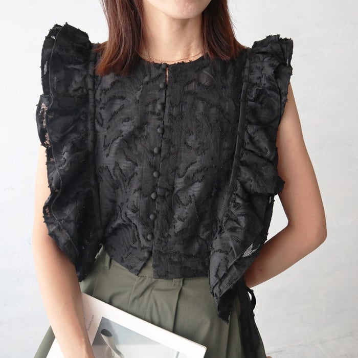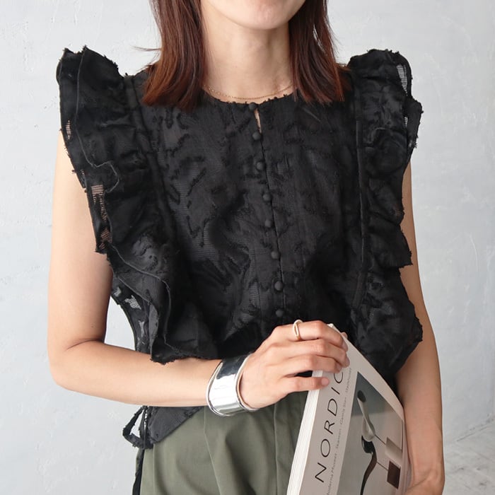 前後2WAY仕様でフリルショルダーが女性らしさを演出し、くるみボタンが高見えも。