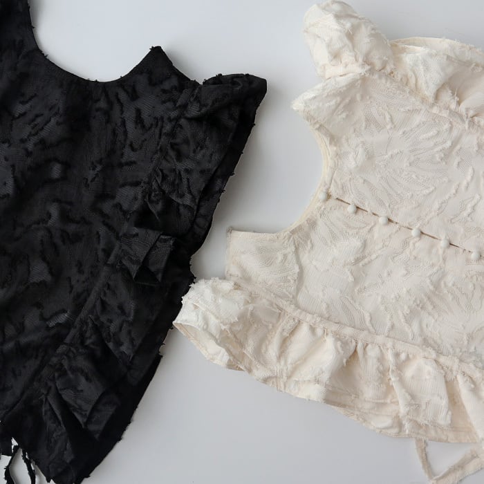 サイドのリボンは結んだりそのままでも違った雰囲気を楽しめます。 ワンピース等とレイヤードするのもオススメな万能アイテムです。