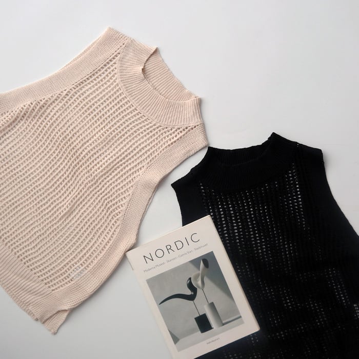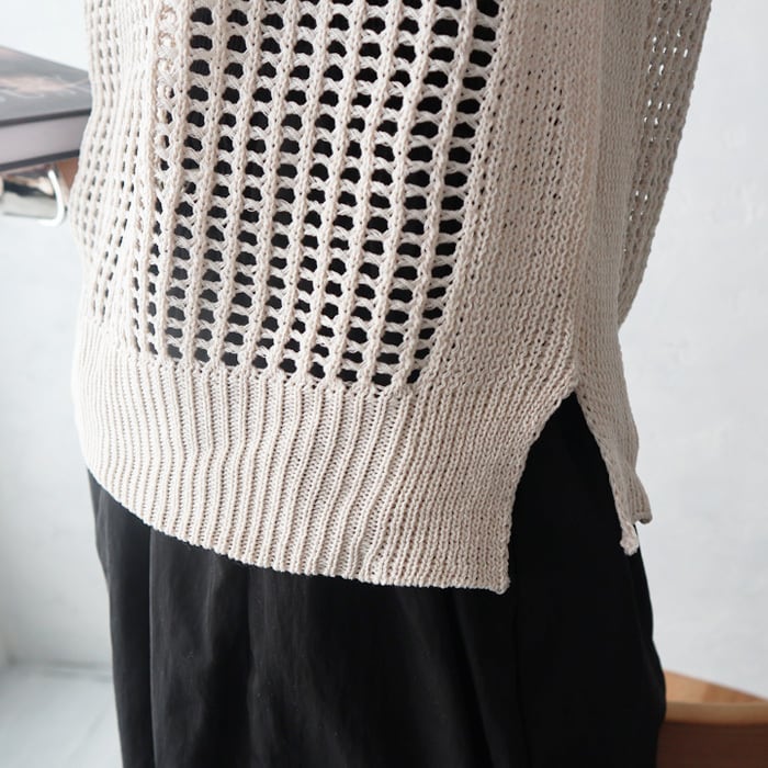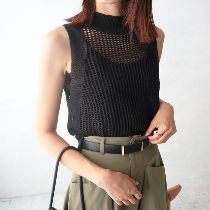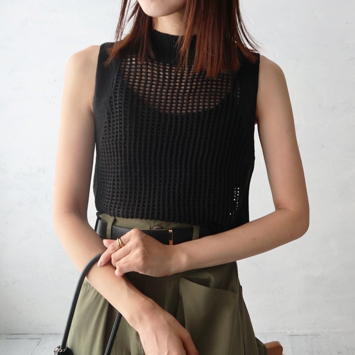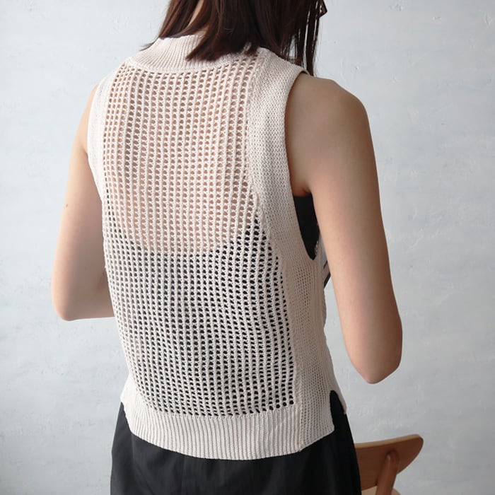 軽やかなフッシュネット編みのノースリーブニット。 ざっくり透け感のあるデザインが涼し気で夏にぴったりなアイテムです。 程良い伸縮性でリラクシーな着心地なのも嬉しいポイント。 レイヤードスタイルもおすすめで、1枚プラスするだけで旬なコーディネートが完成します。