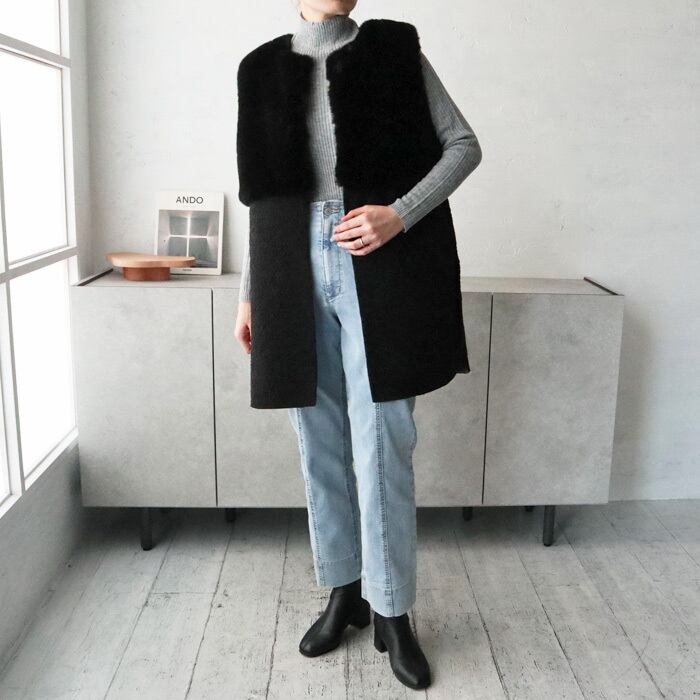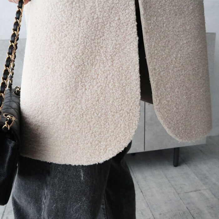毛足の違いで切り替える事でさりげなく目線が上がり、バランス良くみえるデザインになっています。 ヒップから腰回りを覆うミドル丈で、体形カバーしてくれるのも嬉しいポイント◎ フロントはフック仕様で、裏地は切替部分の下からエコレザーを使用しており、ちらっと見えた際のワンポイントに。