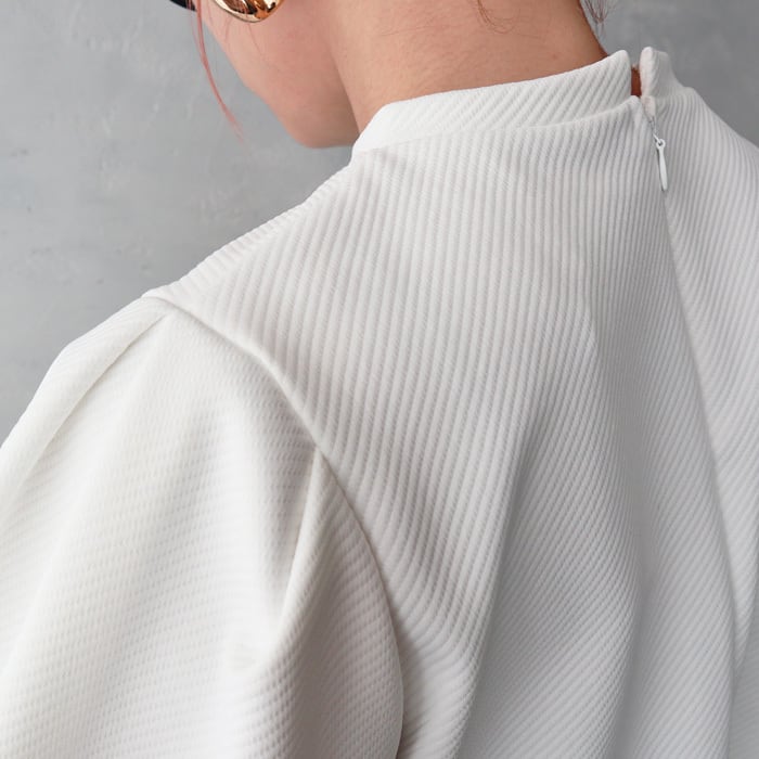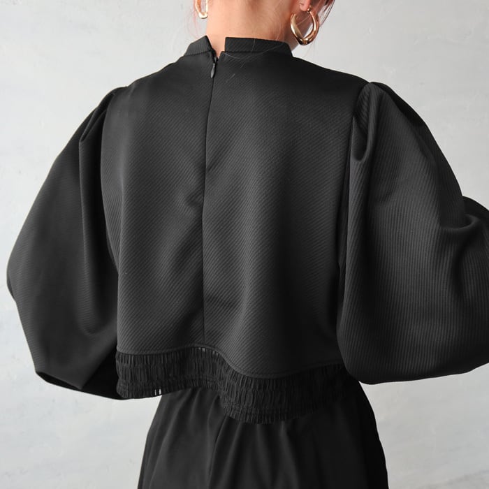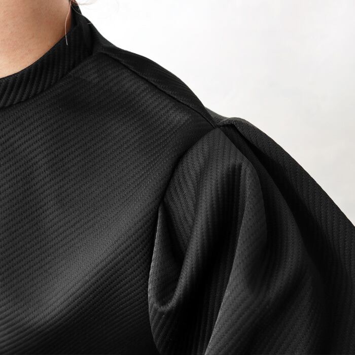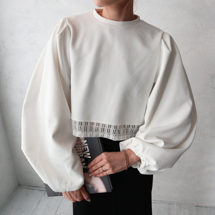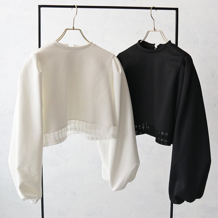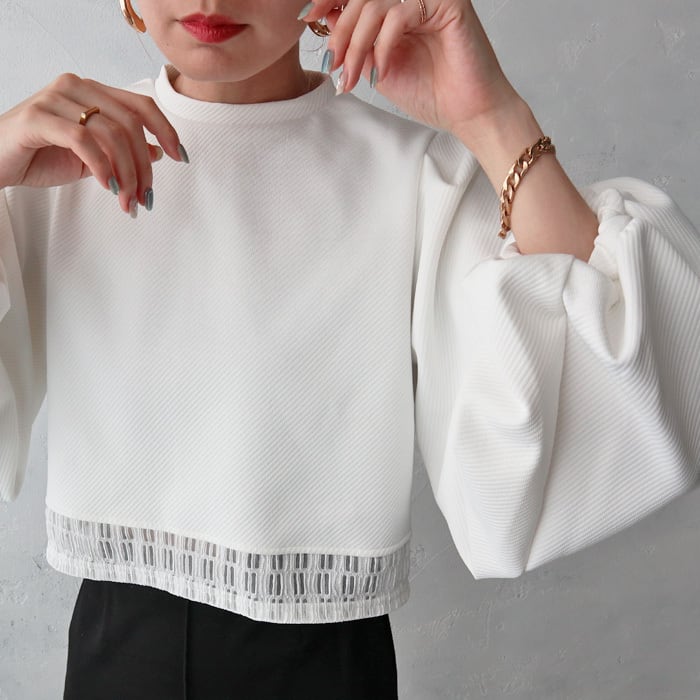 ふんわりとしたバルーンスリーブと裾のブロックレースが華やかな印象のプルオーバー。 トレンド感のあるショート丈で、パフスリーブのデザインが女性らしく上品な印象を与えてくれます。 表面に凹凸感のあるななめリブのようなカットジャガード生地を使用。 一枚でトレンド感のあるコーディネートが完成する優秀トップスです。