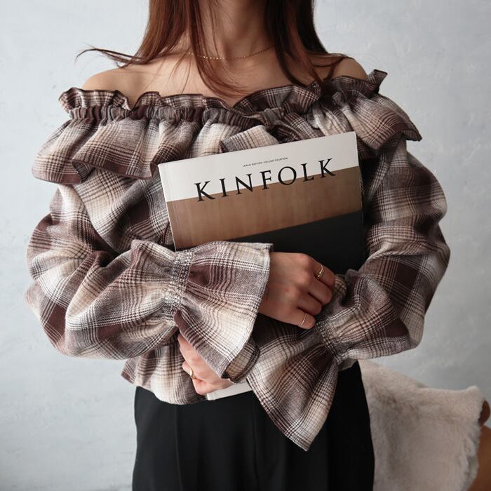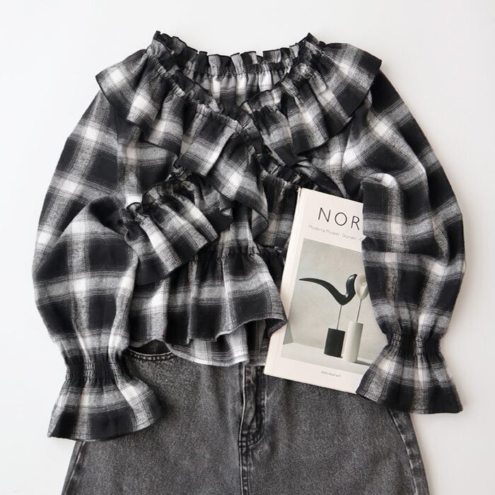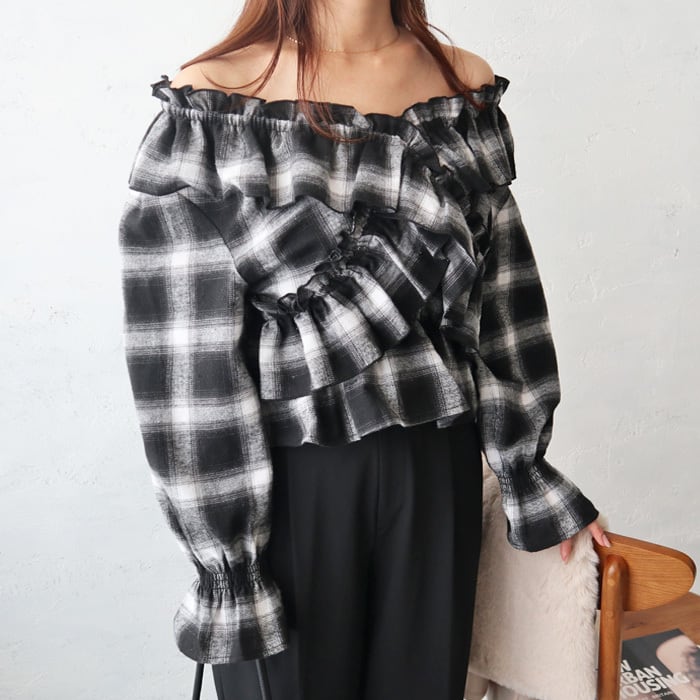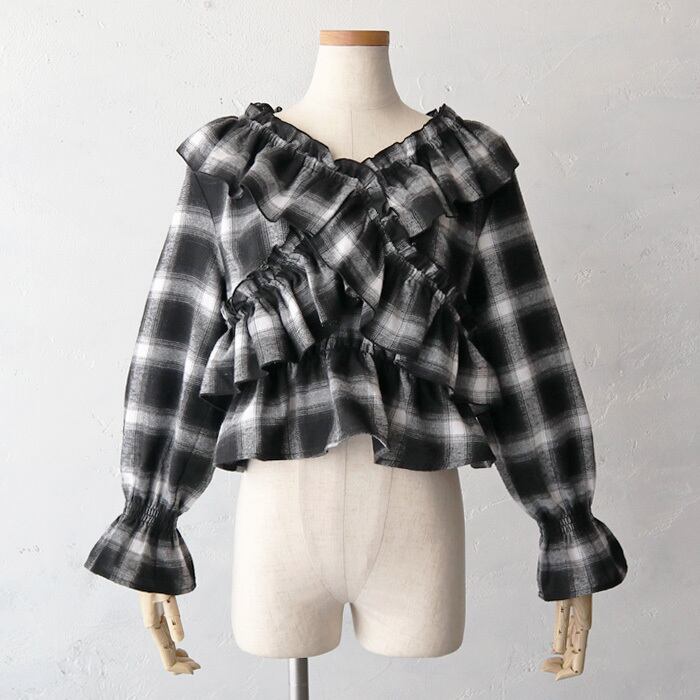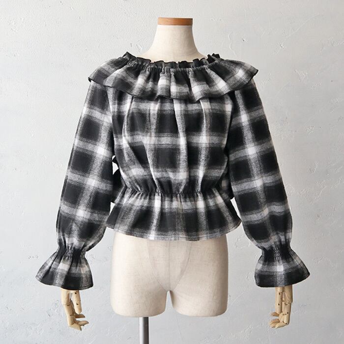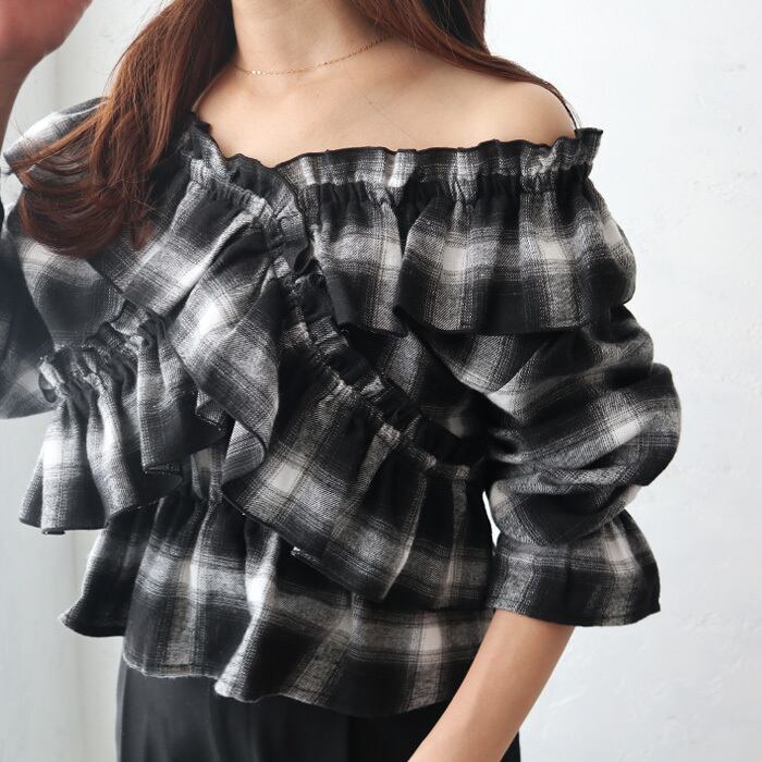 (P55)2WAYマルチウェイオンブレチェック柄フリルギャザーショートトップス