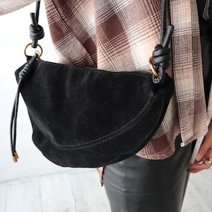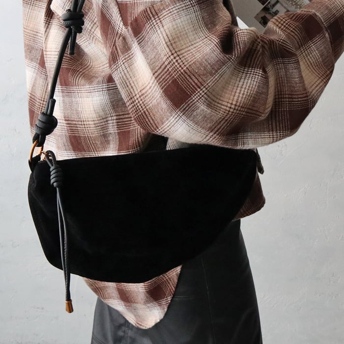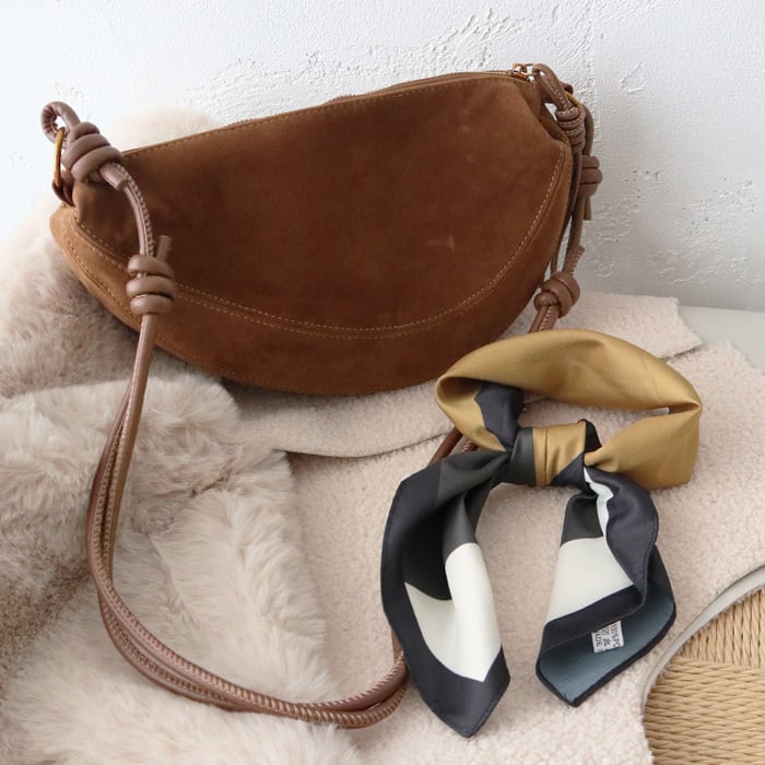 秋冬にぴったりなスエードLOOKショルダーバッグ。 コンパクトながらも収納力があり、デイリー使いにぴったり。 ノットデザインのショルダーがビンテージ感とアクセントに。 持ち手が長めにデザインされており、肩にかけやすく長時間持ち歩いても疲れにくいのが魅力です。