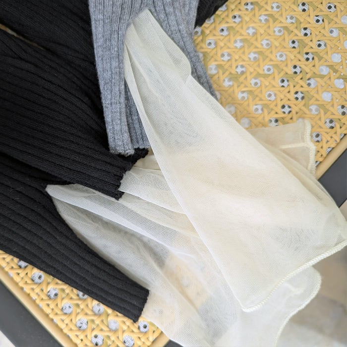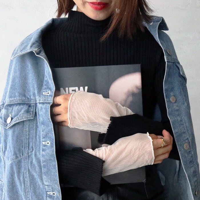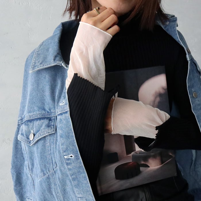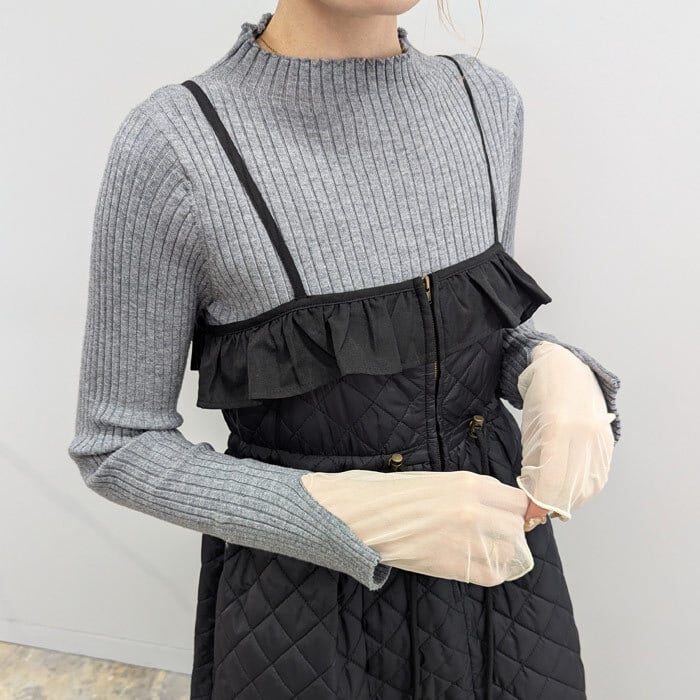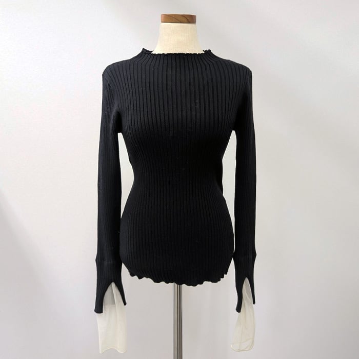 袖口のチュールドッキングのデザインが女性らしい印象のリブニット。 ややハイネックのデザインで、やわらかくもっちりとした素材感で着心地抜群◎ シンプルなデザインなので1枚ではもちろん、ワンピースやサロペットのインナーとしても大活躍するアイテムです。