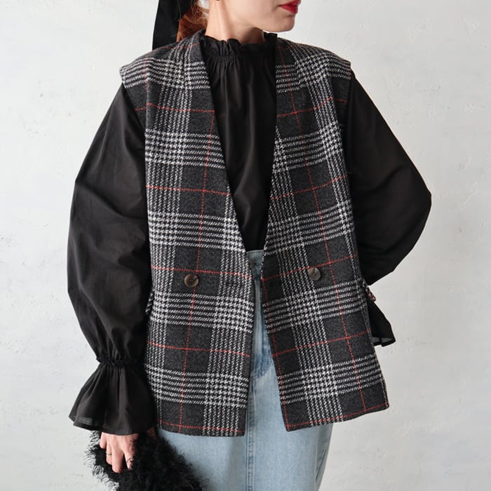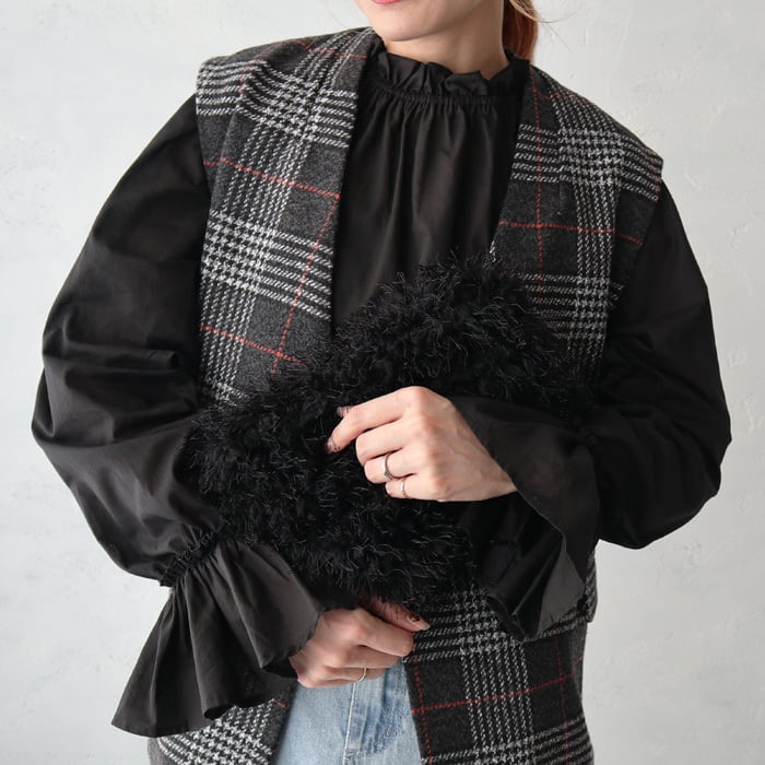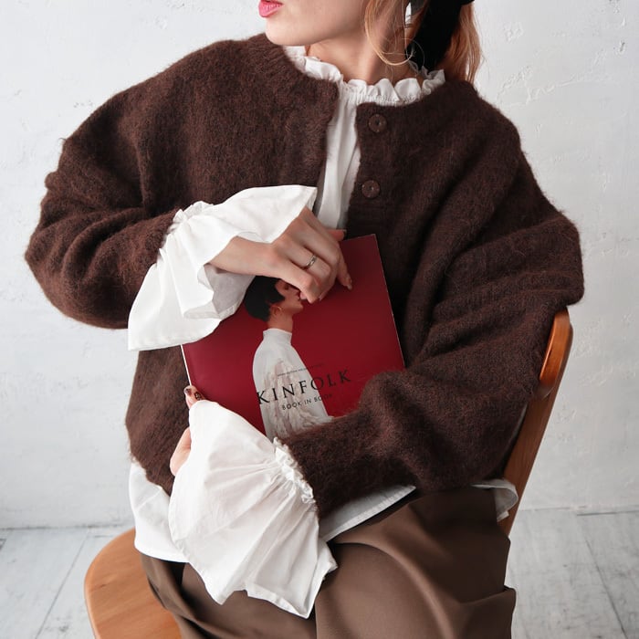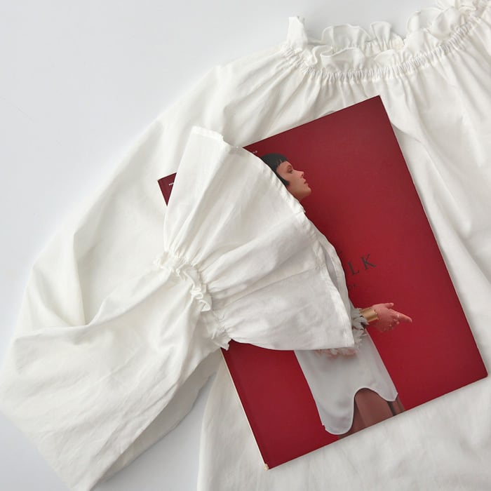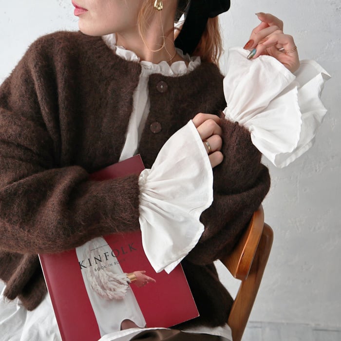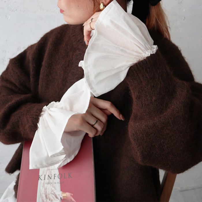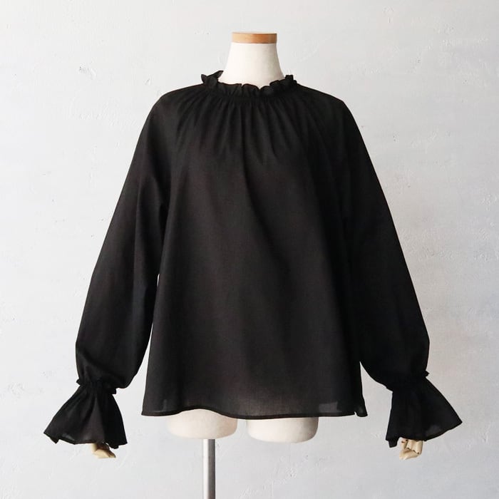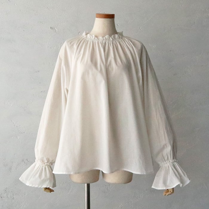 首元とお袖のフリルデザインが魅力的な1枚で華やかな大人可愛いブラウス。 袖口ゴム仕様でボリューム調整が可能+スタンドカラーなのでレイヤードスタイルにも◎ 合わせるアイテム次第でオケージョンにもデイリーにも使える万能ブラウスです。