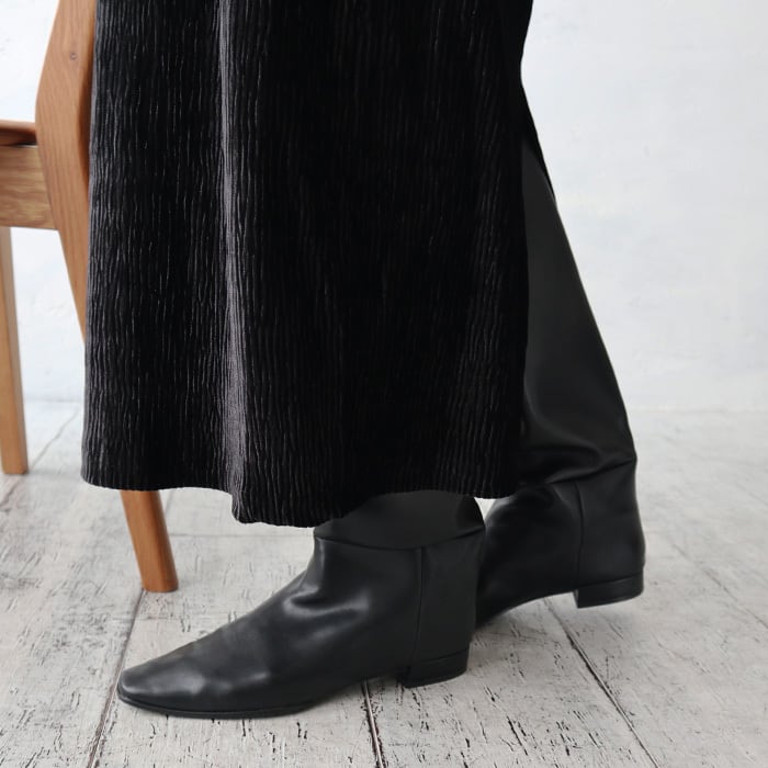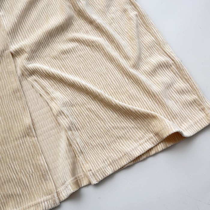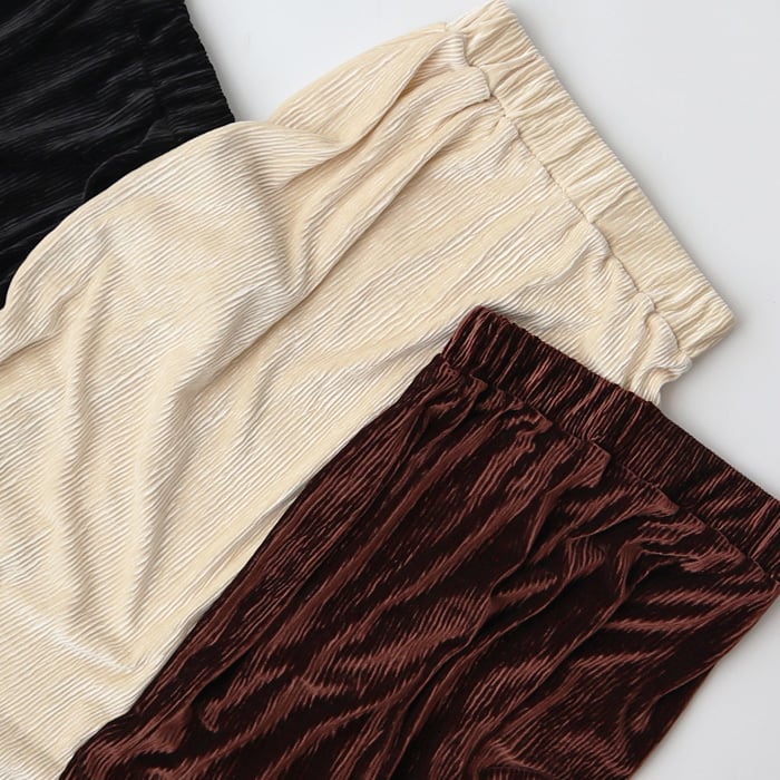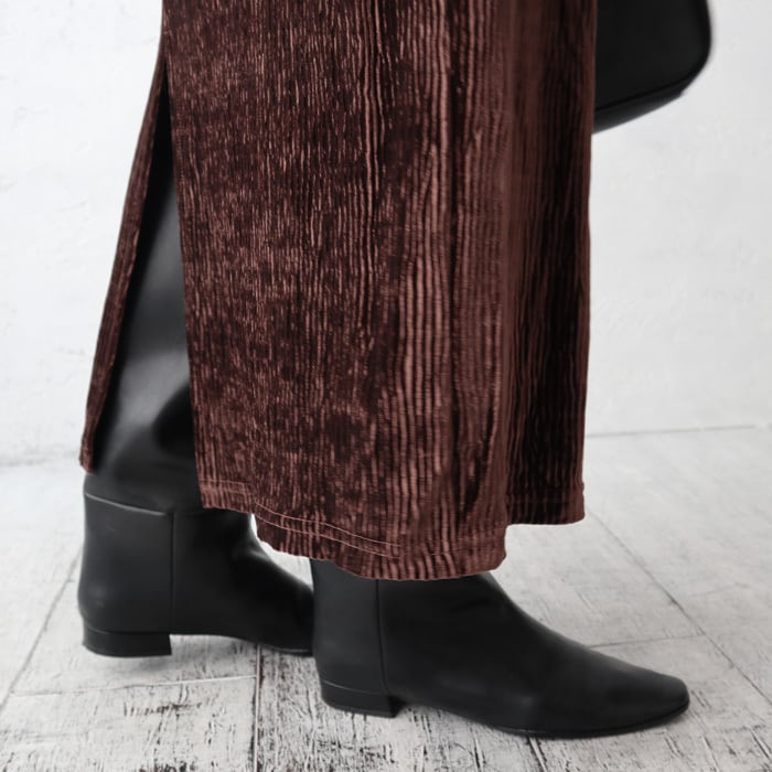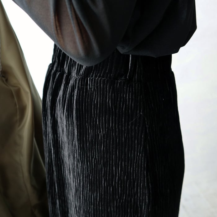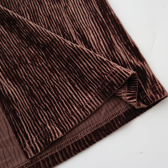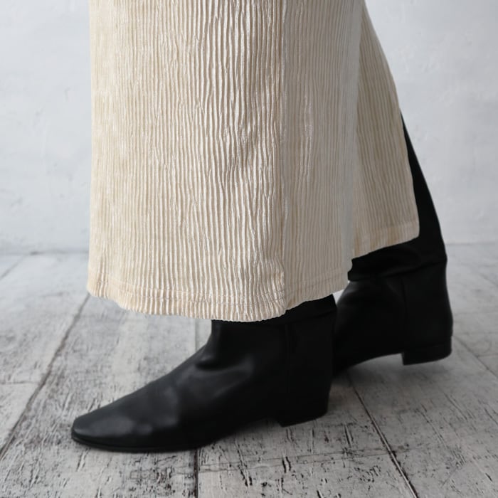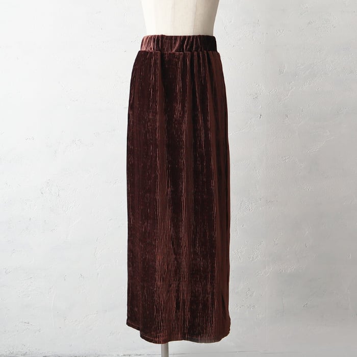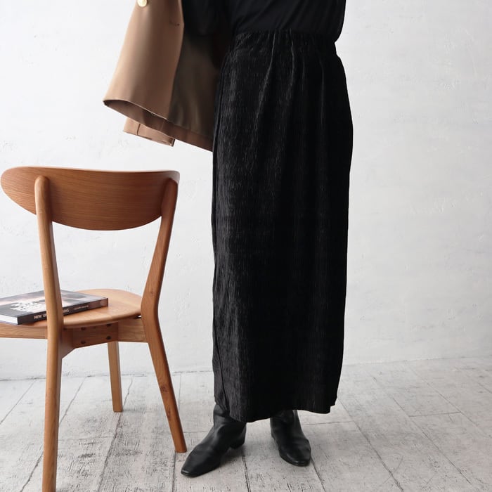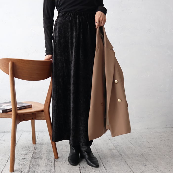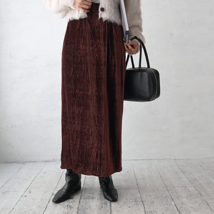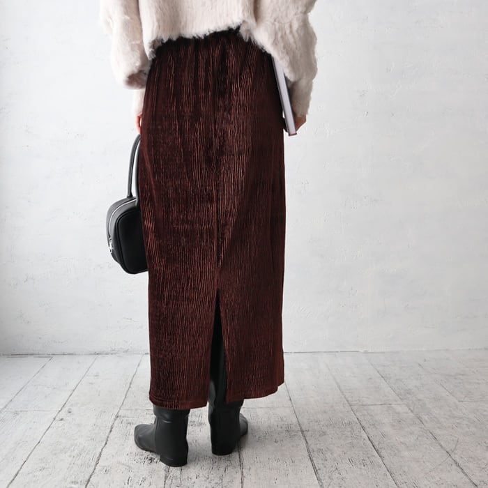 秋冬らしいやや光沢のあるベロア素材を使用したタイトスカート。 伸縮性のあるIラインシルエットに細かなプリーツが脚長効果と季節感を演出。 ウエストゴムで着心地もラクなマストアイテムです。