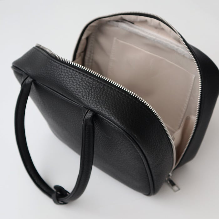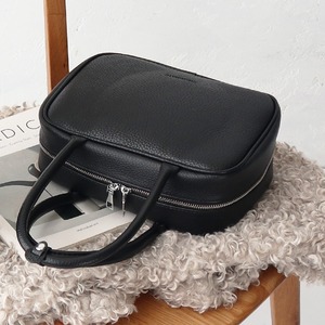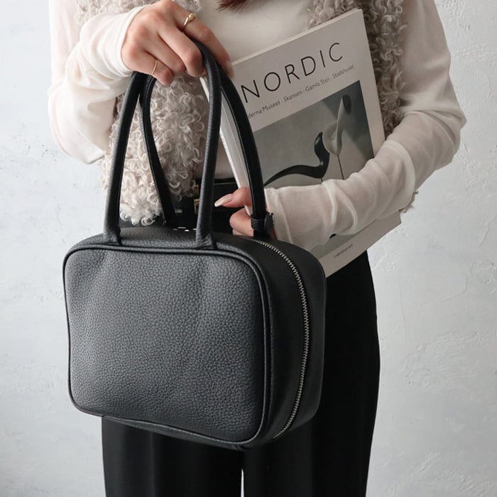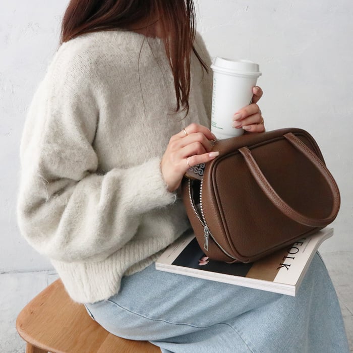 スクエア型のコロンとしたフォルムが大人可愛いボストンバック。 柔らかなフェイクレザーを使用しており、手触りも良くシボ加工が高見えするアイテムです。 トレンド感のあるミニサイズながら、長財布も入るサイズ感で収納力も抜群!