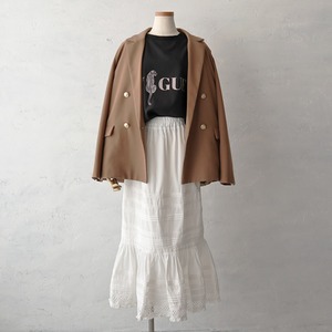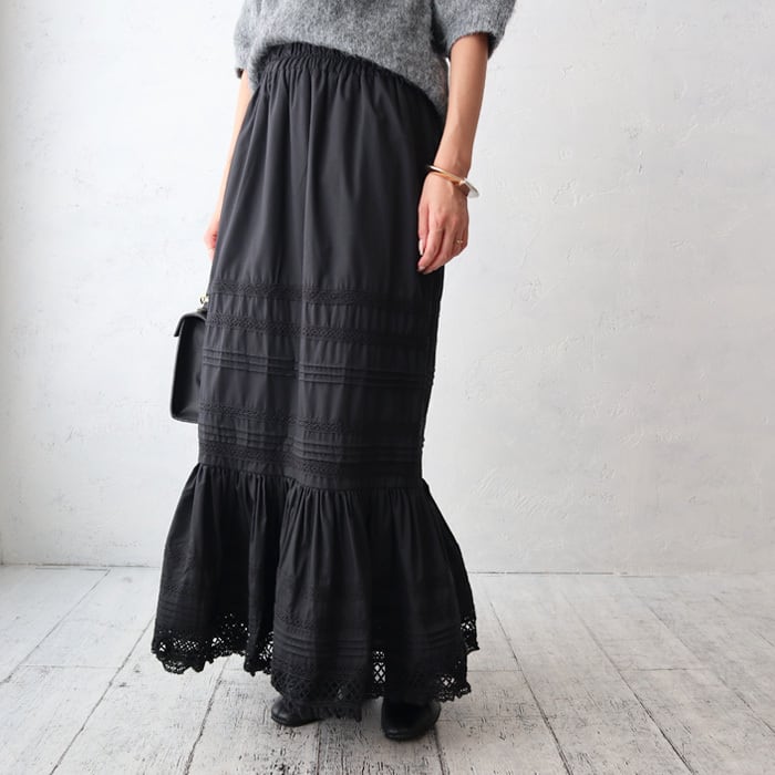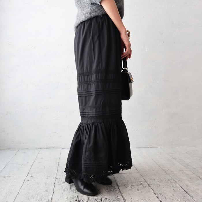 ティアードの立体的なシルエットが女性らしくフェミニンな印象を与えてくれるレーススカート。 タックやレースを組み合わせ、細かいディテールにこだわった1枚で、着用するとふわっと形が引き立ちます。 また、ウエストゴム仕様でストレスフリーな着心地も嬉しいポイント◎ これ一枚で今季らしいこなれ感を演出します。