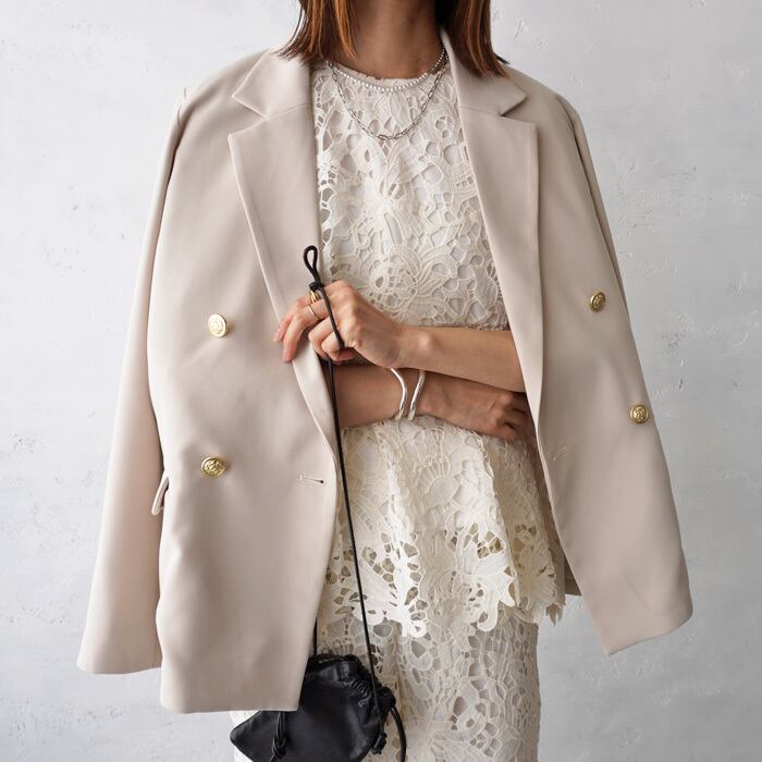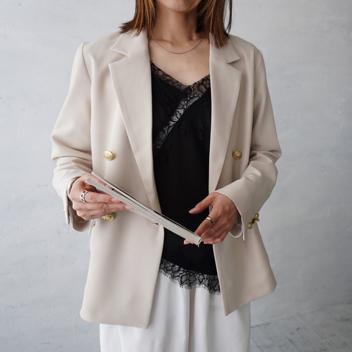 羽織るだけで大人クラシカルな雰囲気が漂う、ゴールド釦×ダブルプレストデザインのジャケット。 ドロップショルダーのゆったりしすぎない絶妙なサイズ感で、ストレスフリーな着心地です。