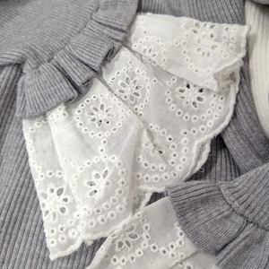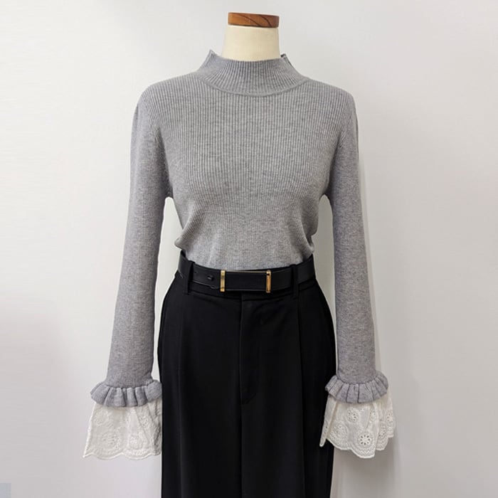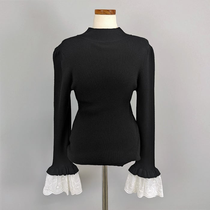 華やかなパンチングレースカフスが女性らしさを格上げしてくれるデザインニット。 伸縮性のある柔らかなリブニット素材で着心地も抜群!