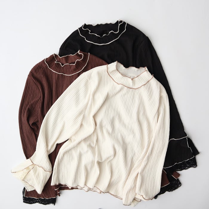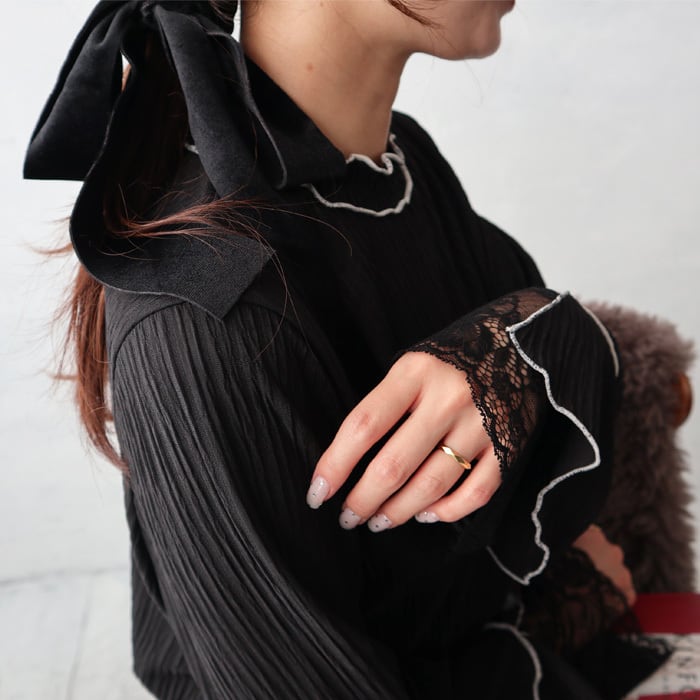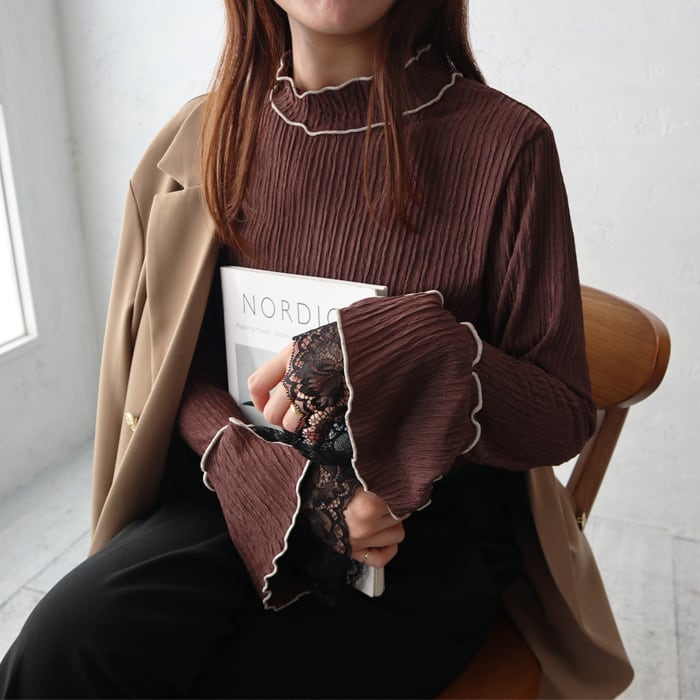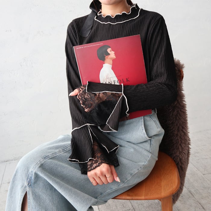 トレンドライクなバイカラーメロー&お袖のレースがポイントになった女性らしいトップス。 ボディラインを拾い過ぎないシルエットなので、華奢見え効果も◎