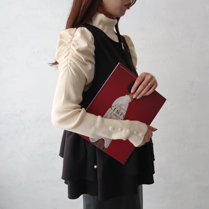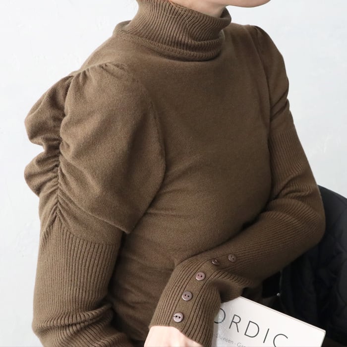立体的なギャザーパフスリーブが目を惹く、デザイン性のあるニット。 リブ切替のロングカフス仕様で飾りボタンも洒落見えポイントです。 伸縮性があり体に程よくフィットする素材で着心地も良く、1枚で女性らしさをアップしてくれるアイテムです。