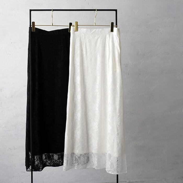 繊細な花柄レースが上品で大人フェミニンな印象のレースナロースカート。 足首の程よい肌見せが抜け感もあり、伸縮性のある素材でリラクシーな履き心地も嬉しいポイント。 シンプルなデザインなのでどんなアイテムとの相性も良く、着回しの効く一枚です。