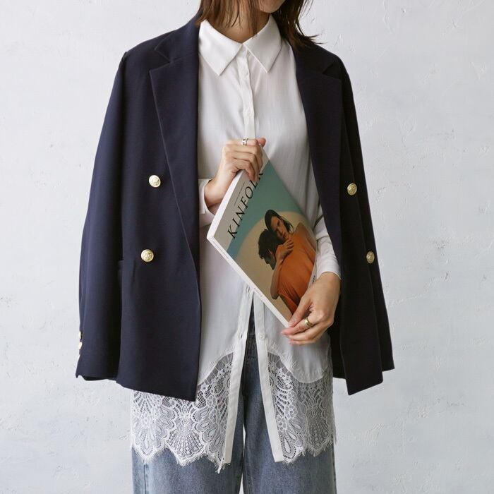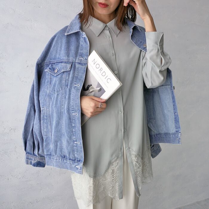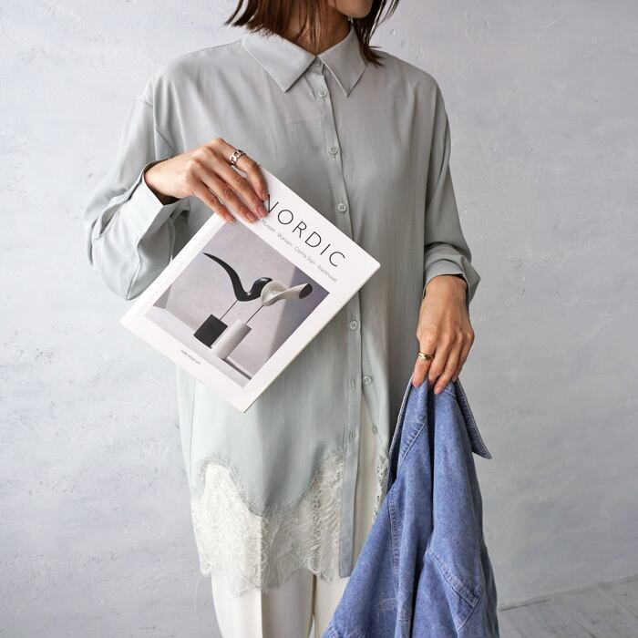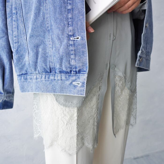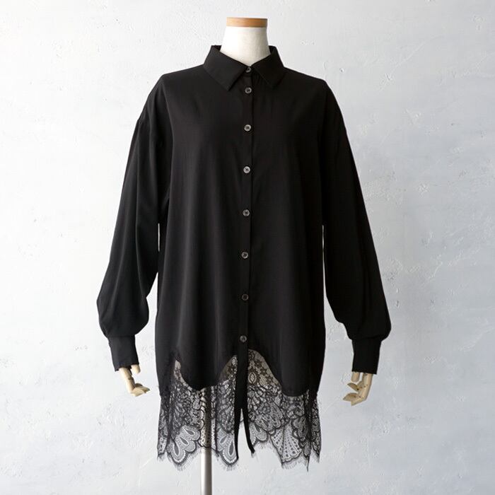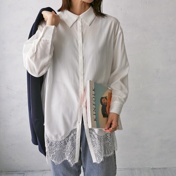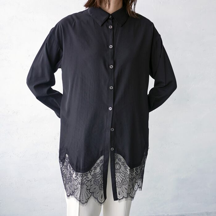 繊細な裾レースが魅力的なシンプルながらも存在感のあるロングシャツ。 柔らかい生地感で軽やかな着心地も嬉しいポイント◎ カジュアルからオフィスシーンなど様々なコーディネートにマッチし、一枚で着映えるアイテムです。 裏地:なし 伸縮性:なし 透け感:カラーによりややあり ▼モデル身長172cm ▼サイズ詳細・平置き実寸 着丈:87cm 身幅:53cm 肩幅:52cm 袖丈:55cm ▼素材 本体:ポリエステル59%・レーヨン41% 裾レース:ナイロン100%