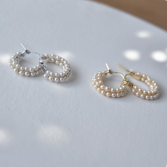 フェイクパールをふんだんに使用した華やかさと遊び心をプラスしたフープピアス。 ぷっくりと立体感のあるフォルムでとても軽い付け心地です◎ デイリーからオケージョンまで幅広いシーンで大活躍間違いなしのアイテムです。 ▼モデル身長167cm ▼サイズ詳細・平置き実寸 全縦:2.6cm 横最大:2.2cm 重さ:3.0g(片耳) ▼素材 メタル・合金・フェイクパール