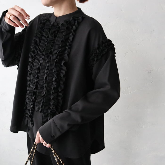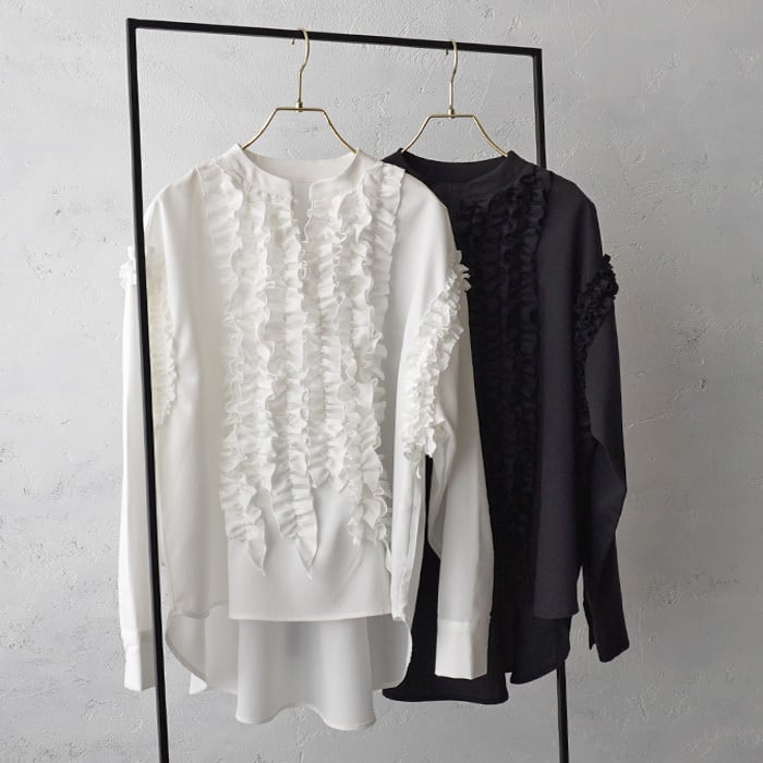 フロントと肩のフリルディテールが女性らしさを引き立て、華やかな印象を与えてくれるブラウス。 前後差をつけた着丈は程よい抜け感を演出し、着心地の良い柔らかい素材でオンオフ問わず着ていただけます。 裏地:なし 伸縮性:なし 透け感:カラーによりややあり ▼モデル身長167cm・172cm ▼サイズ詳細・平置き実寸 着丈:65~79cm 身幅:66cm 肩幅:57cm 袖丈:52cm ▼素材 レーヨン65%・ポリエステル35%