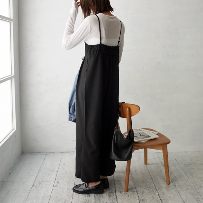 繊細なレースをあしらったキャミソールデザインのオールインワン。 華奢なストラップと程よいワイドシルエットが女性らしく抜け感のある印象に。 また、肩ストラップで丈の調節も可能◎ インナー次第でロングシーズン着回しでき、カジュアルにもフェミニンにも楽しめる万能アイテムです。