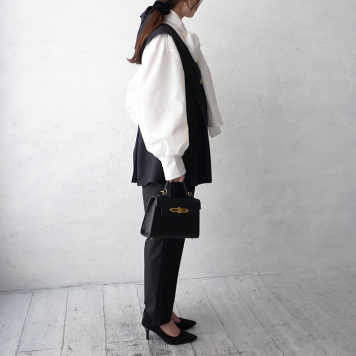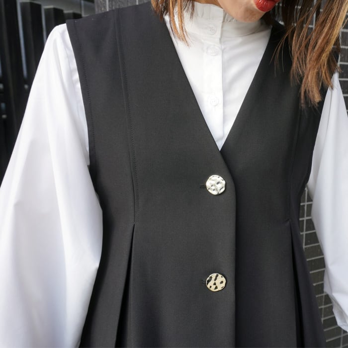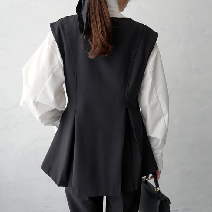 別売りのテーパードパンツとのセットアップ着用も可能なニュアンスメタルのボタンがポイントのベスト。 程良いAラインシルエットとウエストからのプリーツデザインが洒落感と大人モードを演出。 ストレスフリーな着心地でオフィスシーンやセレモニーにもおすすめです。
