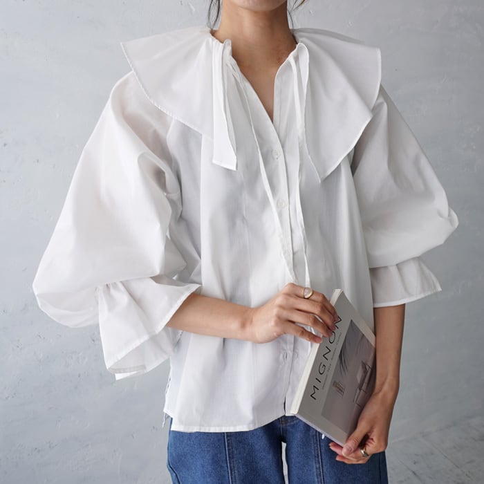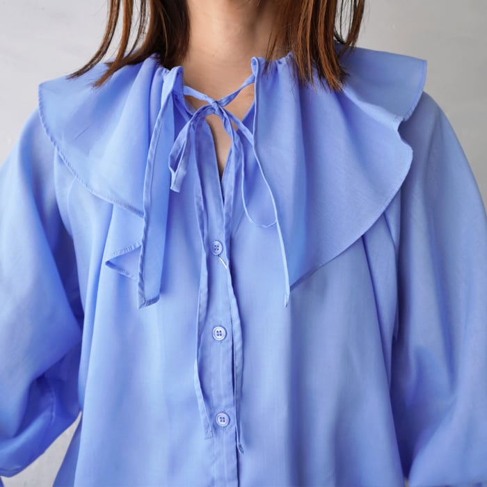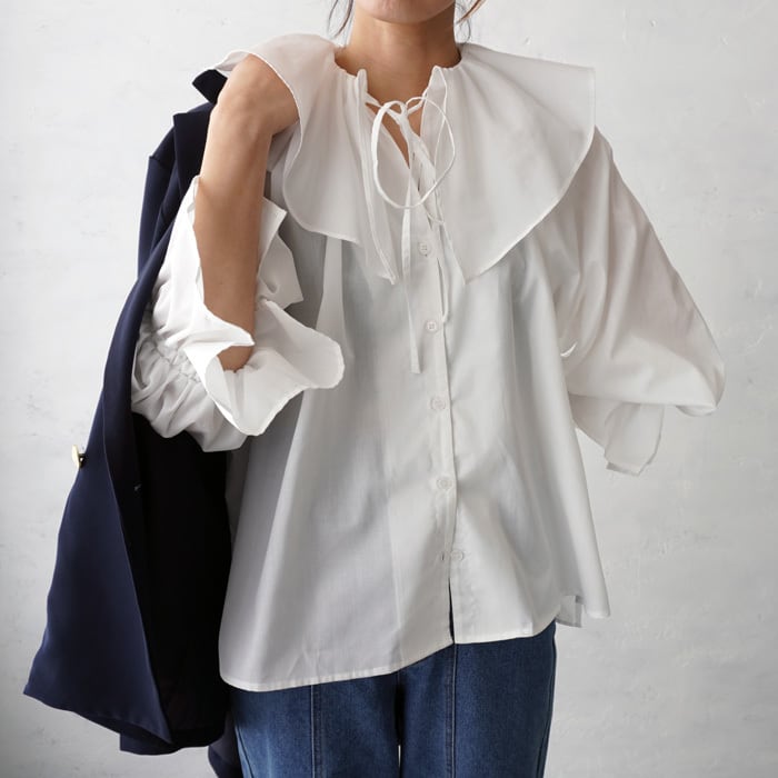 様々なコーデが楽しめるマルチウェイビッグカラーブラウス。 フロントリボンの調節でデコルテ部分のデザインが変えられ キャンディースリーブで袖口はゴム入りなので腕周りを程よくカバーしてくれます。 ハリ感のある生地できちんと感もキープ。 投入するだけで華やかな印象になる1枚です。