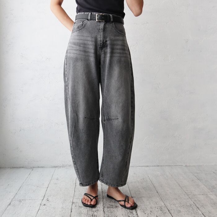 トレンドのバレルシルエットが目を惹くデニムパンツ。