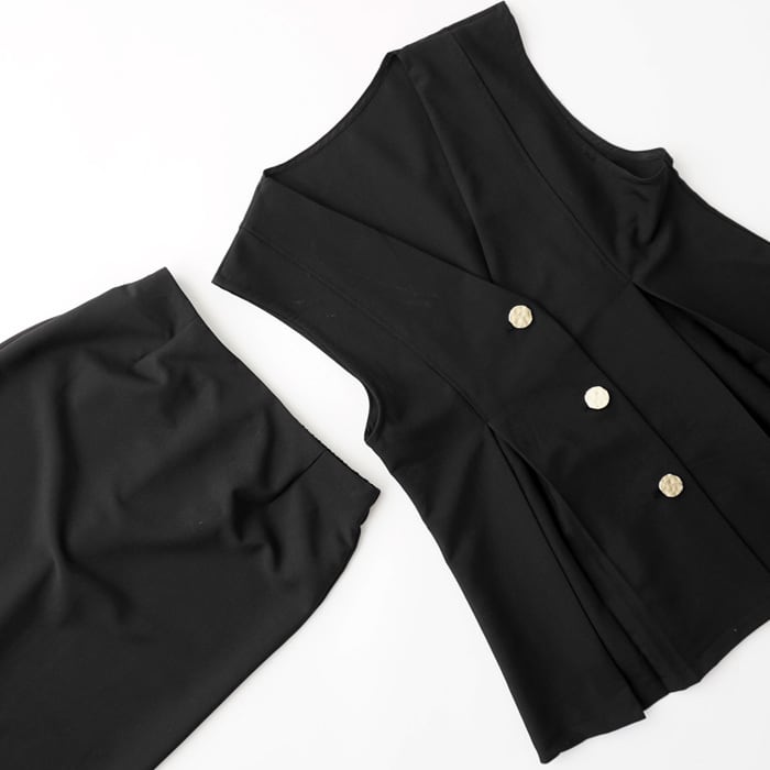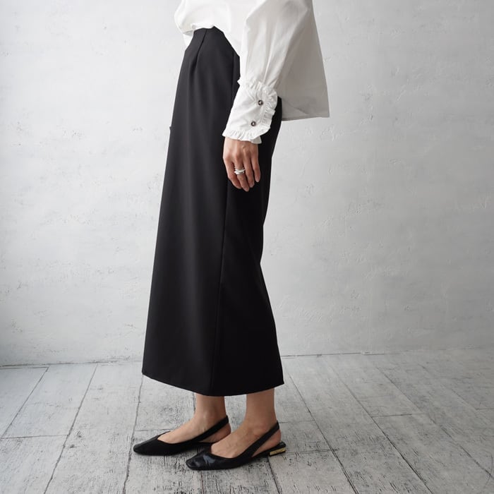別売りのベストとセットアップで着用可能な、オンオフ使えるストレートタイトスカート。