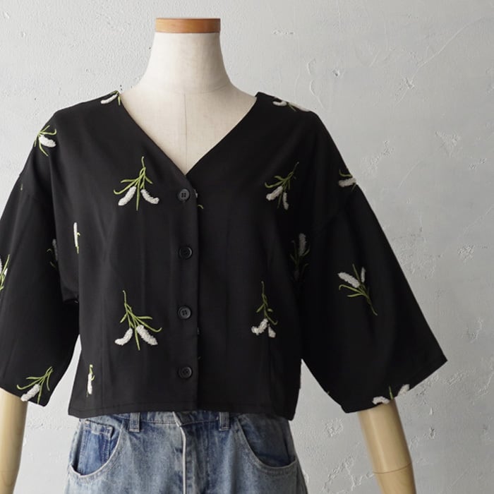 季節を感じるフラワー刺繍が女性らしく華やかな印象のハーフスリーブショートトップス。