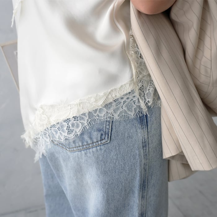 いつものコーデにプラスするだけで華やかに決まるアイラッシュレースキャミソール。 レイヤードはもちろん、1枚風にも着れロングシーズン大活躍◎ 高見えする繊細なヒゲレースを使用しているので上品でエレガントな雰囲気を演出し、 今季ならではのスタイルに仕上がります。 裏地:なし 伸縮性:なし 透け感:ややあり ▼モデル身長158cm ▼サイズ詳細・平置き実寸 S~M相当 着丈:55~78cm 身幅:41cm ▼素材 ポリエステル100%