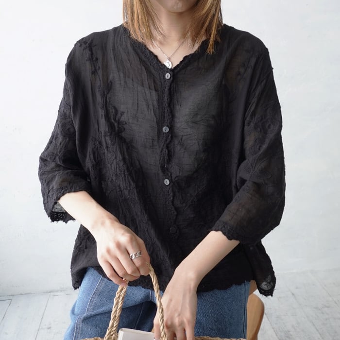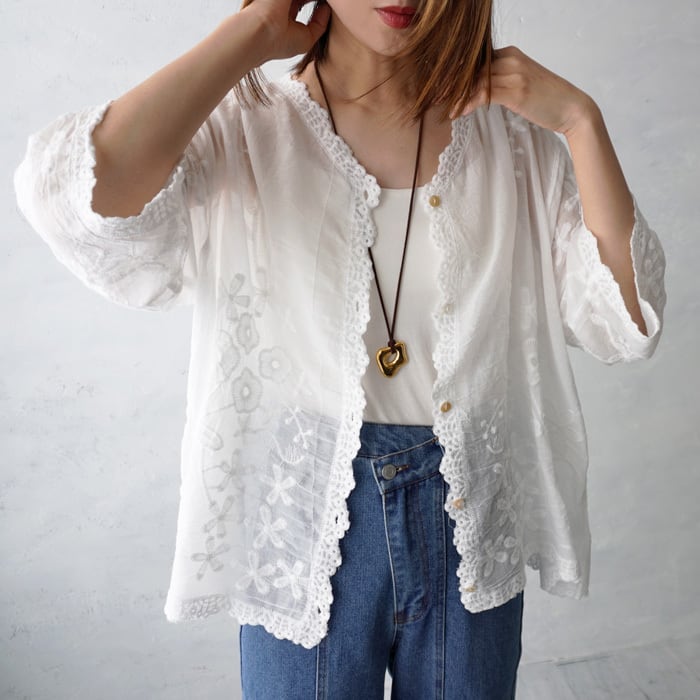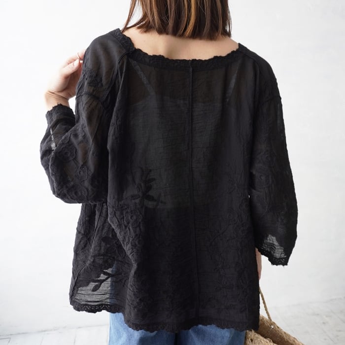 繊細なレース素材を使用したやわらかな風合いが特徴のブラウス。 ほんのりと肌が透ける軽やかなデザインで、 女性らしくナチュラルな雰囲気を演出してくれます 首元はすっきりと上品に見えるデザインで、 甘くなりすぎない絶妙なバランスに仕上げました。 身頃は程よくゆとりを持たせ、ボディラインを拾いにくいシルエットで 気になる部分をさりげなくカバー◎ ▼モデル身長172cm ▼サイズ詳細・平置き実寸 M 着丈:65cm 身幅:65cm 肩幅:49cm 袖丈:42cm ▼素材 綿100%