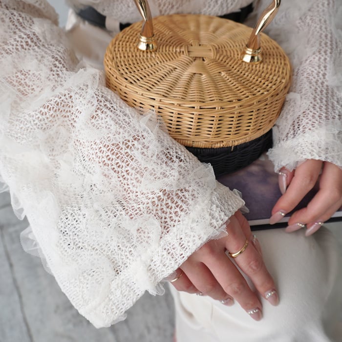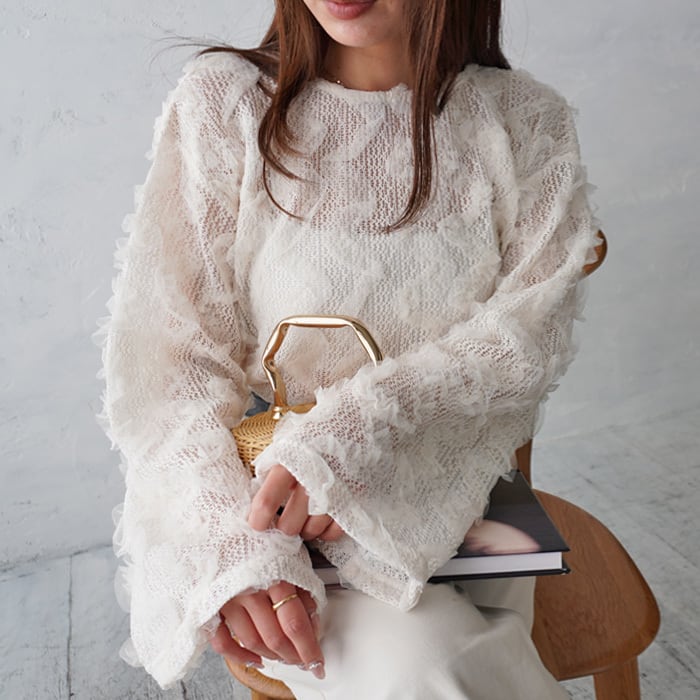 全体的にあしらわれたチュールフリルが 大人可愛いメッシュプルオーバー。 春夏の透け感が楽しめ涼し気で、 軽やかな着心地なのでジャケットのインナー使いとしてもおすすめです。 裏地:なし 伸縮性:なし 透け感:あり ▼モデル身長158cm ▼サイズ詳細・平置き実寸 M 着丈:45cm 身幅:57cm 肩幅:50cm 袖丈:55cm ▼素材 基布:ポリエステル100% チュール部分:ポリエステル100% 留め糸・上糸:ナイロン100%・下糸/ポリエステル100%