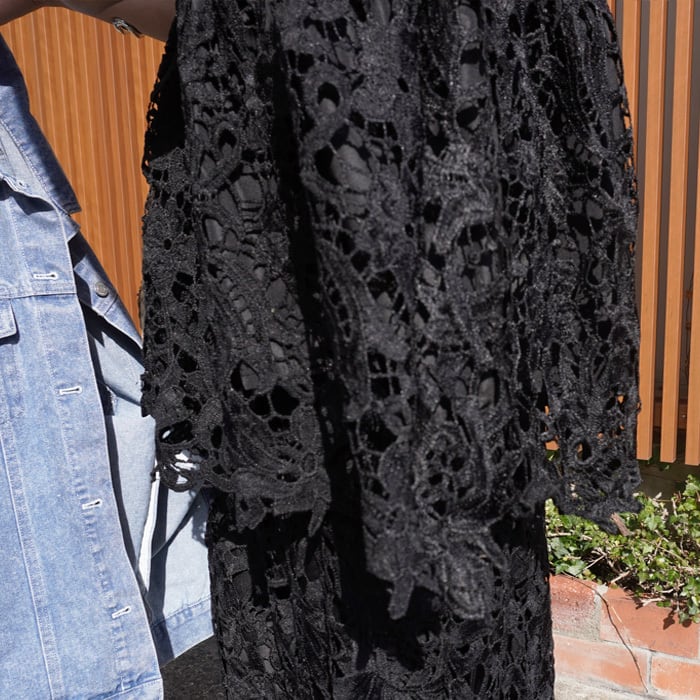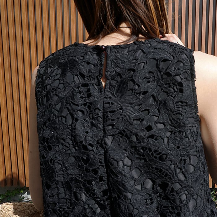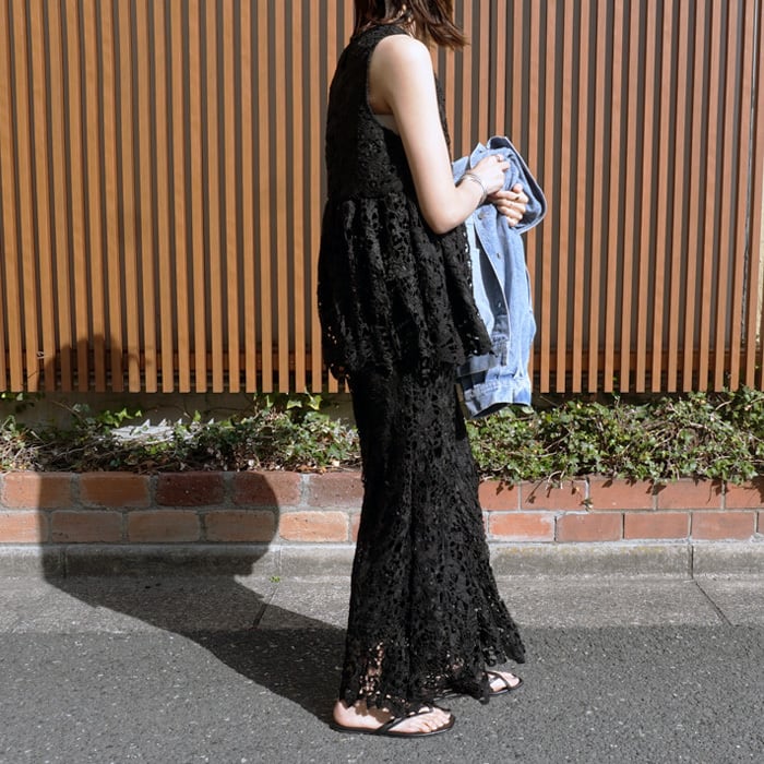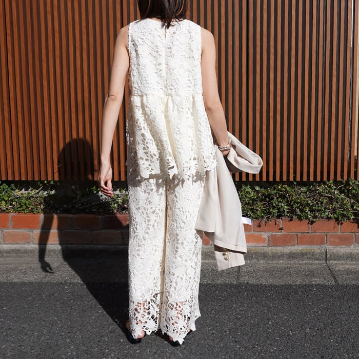 別売りパンツとのセットアップが楽しめるケミカルレースペプラムブラウス。