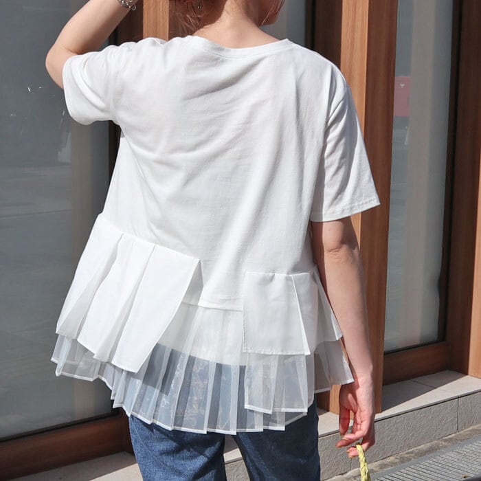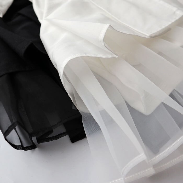 カット生地とハリ感のある生地、さらにチュールを施したドッキングデザインが個性的で可愛い1枚です。 大人可愛いアシンメトリーのヘムコンシャスに程よい広がりでオンオフ使えるアイテムです。 裏地:なし
