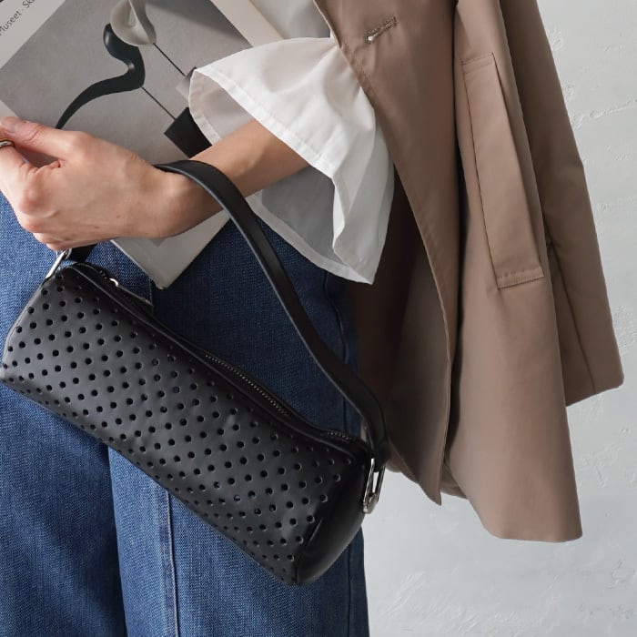 パンチングデザインが特徴的なコロンとしたミニシリンダー型のバック。 コーデのポイントとして楽しめるフェイクレザー素材でモードな印象に。 ワンショルダーで持ち運びしやすいのも嬉しいポイントです。 内ポケットなし ▼モデル身長172cm/着用アイテム ▼サイズ詳細・平置き実寸 縦:約9m 横:約24cm 持ち手:約35cm マチ:約10cm ▼素材 合皮・ポリエステル 予約商品の為、発送日が前後する場合がございます。 他の商品と注文された場合、遅い納期に合わせての発送となります。