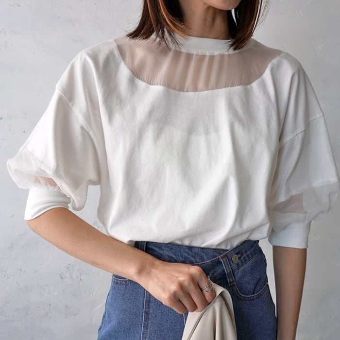 程良いシアー切替がポイントのプルオーバー。 お袖のボリュームさがさりげなく腕回りをカバーし、華奢見え効果も◎
