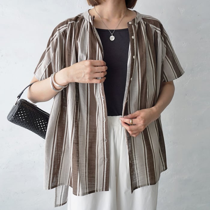 一枚で抜け感と大人っぽさが演出できる、ストライプ柄のブラウス。
