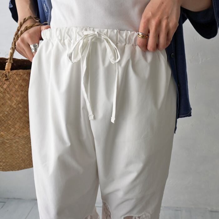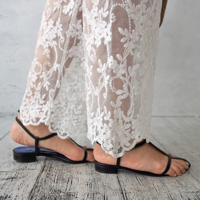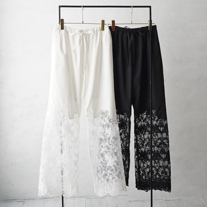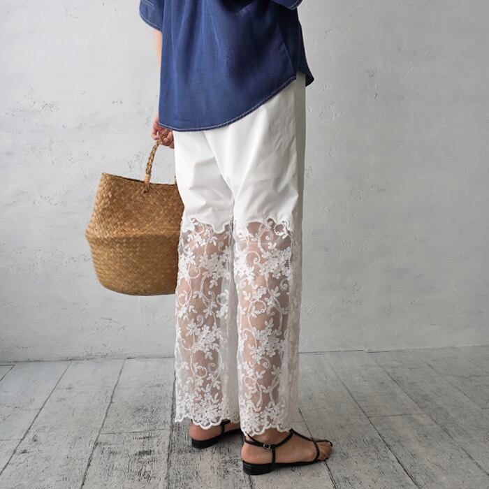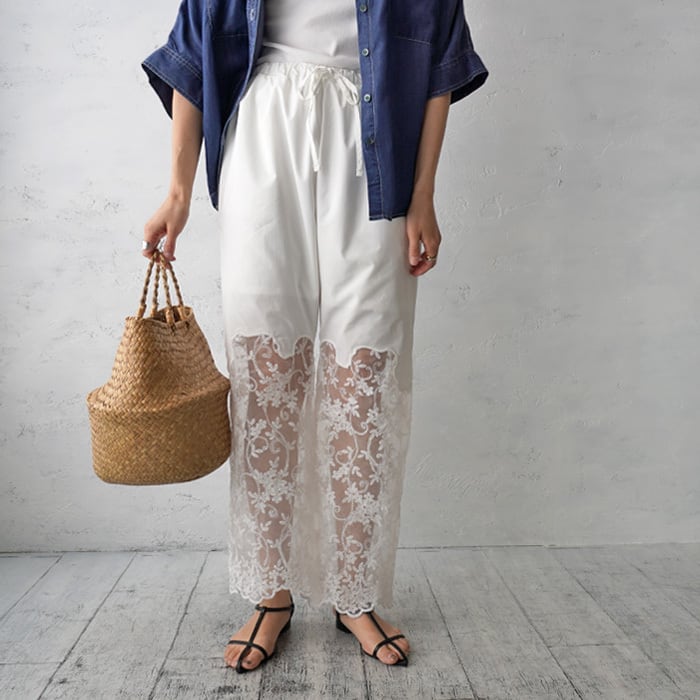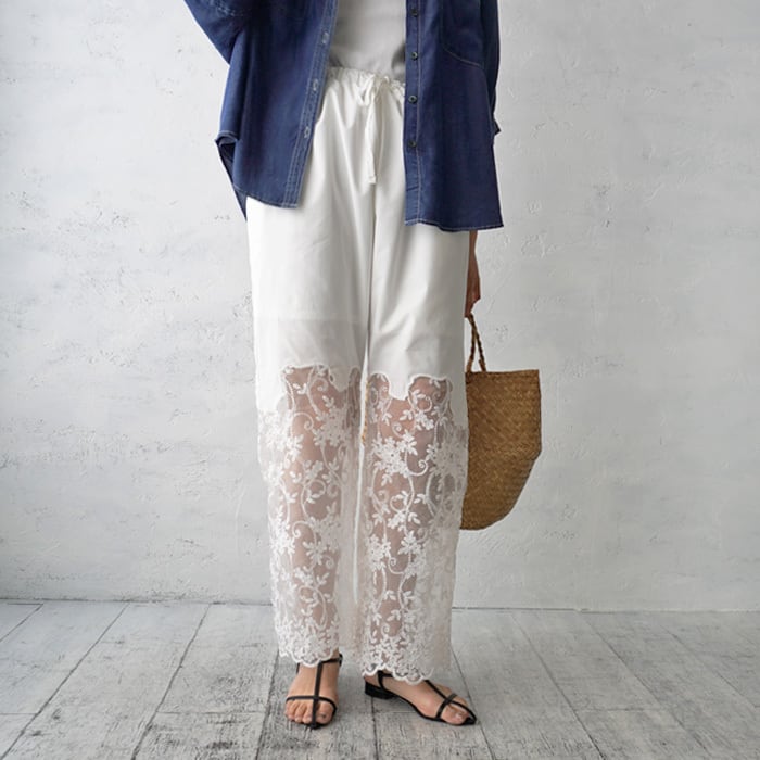 裾にあしらわれたフラワー刺しゅうスカラップレースが目を惹く、シアー切替パンツ。