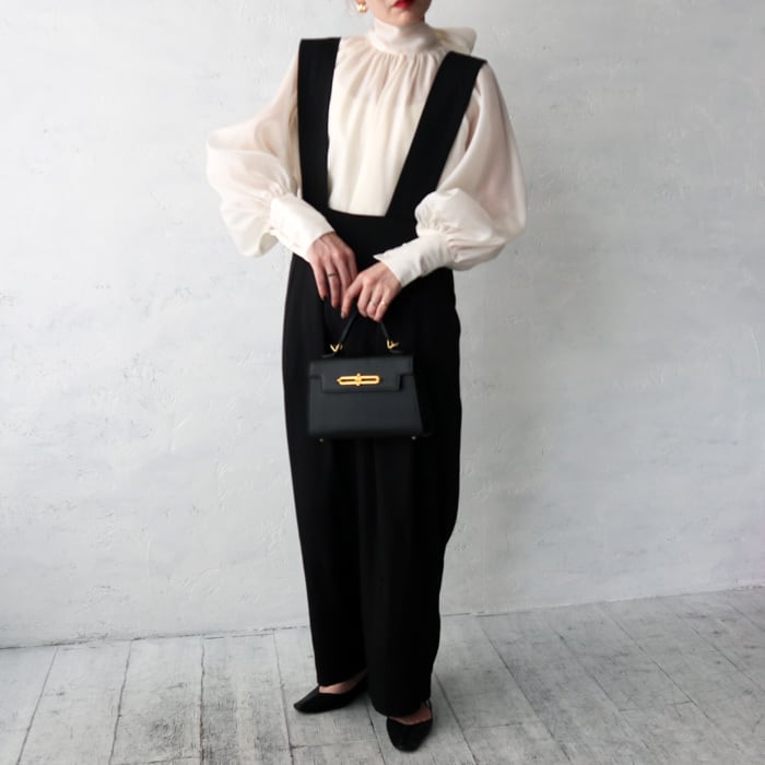 ツイル素材を使用したハイウエストサロペット。 程よいシルエットが体のラインを拾わず綺麗に着て頂けます。 ハイウエストで足長効果も兼ね備え、大人っぽく落ち着いたデザインでインナー使いでオンオフ楽しめます。