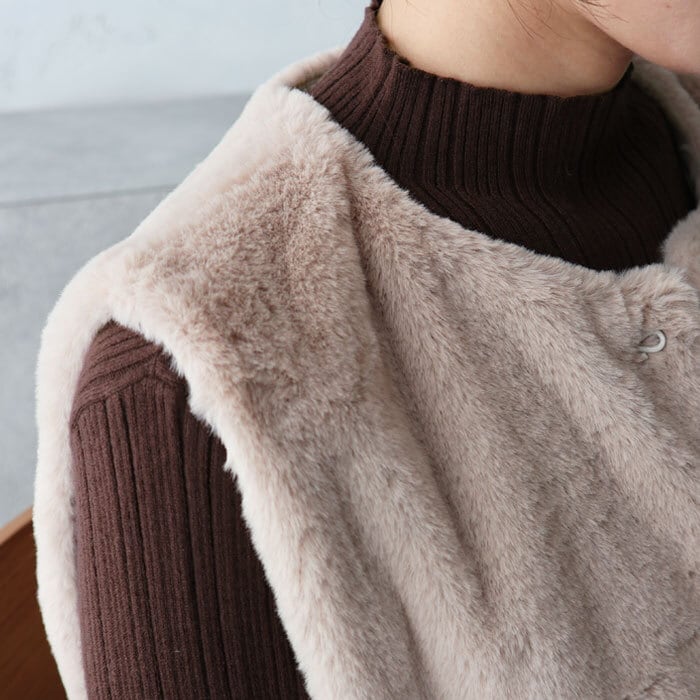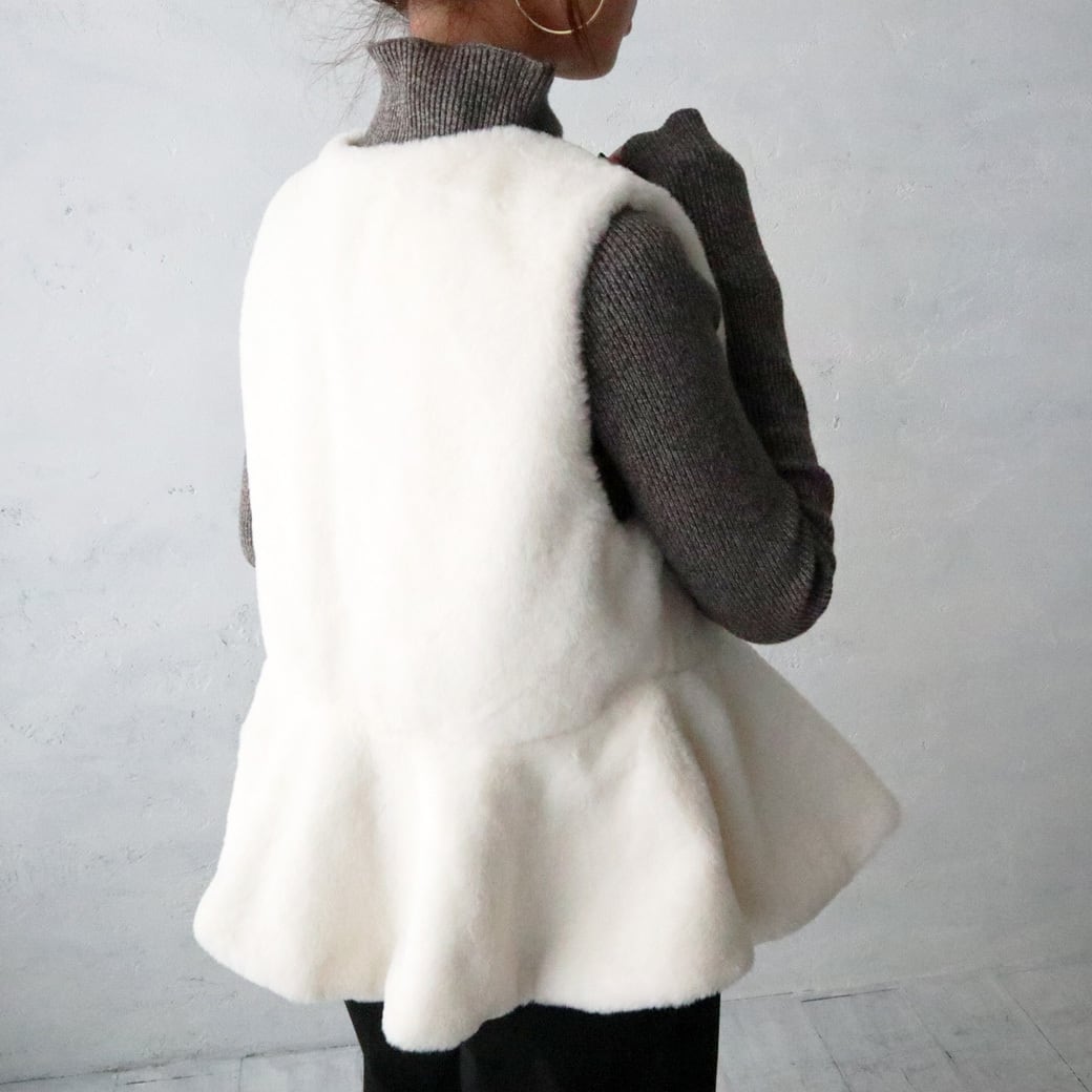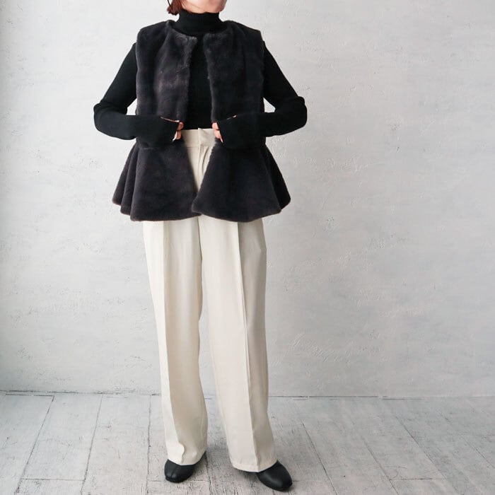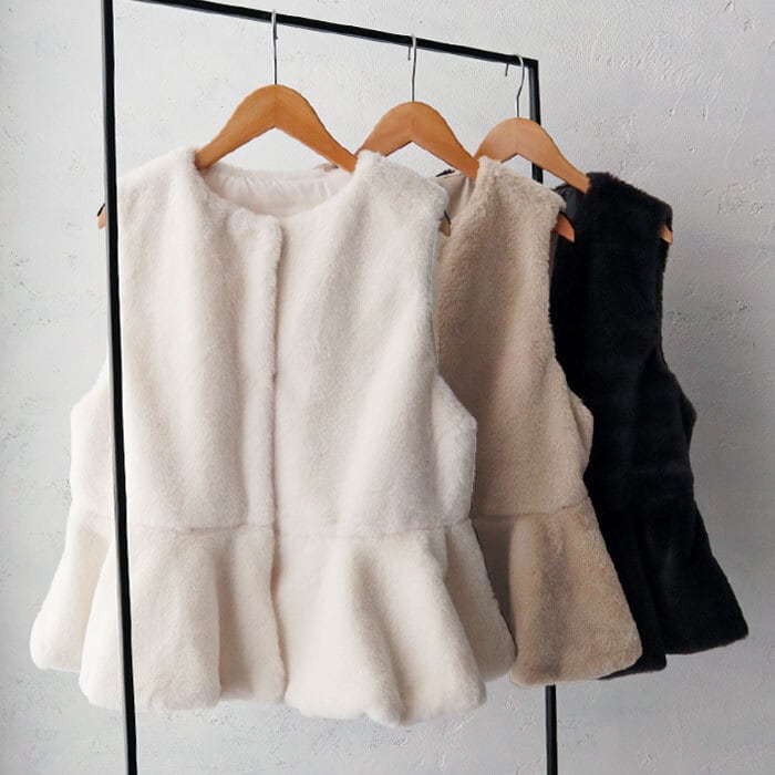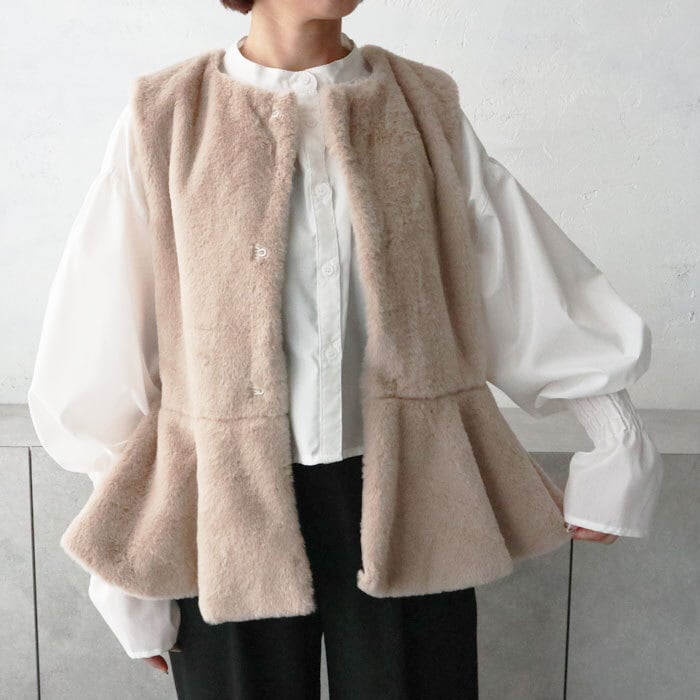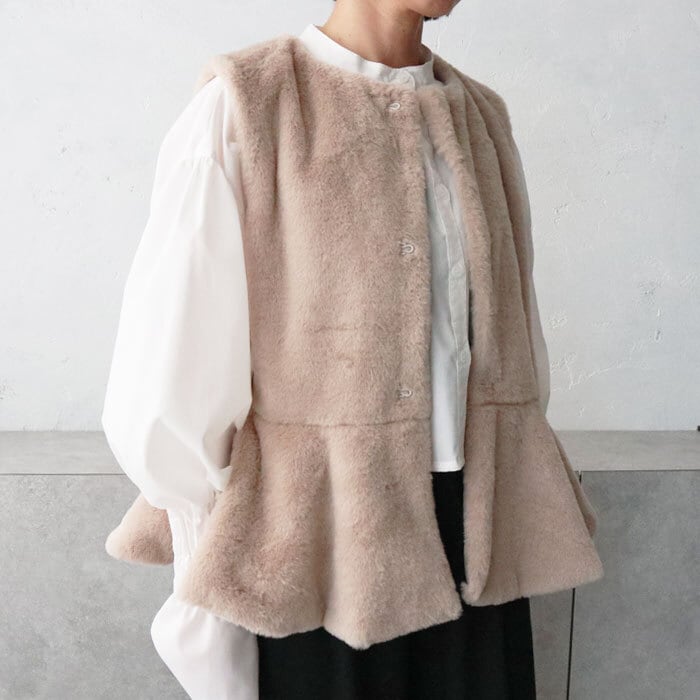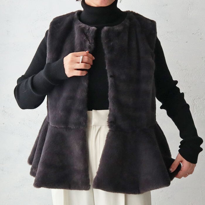 ファー×ペプラムのデザインがフェミニンな印象のベスト。 いつものコーディネートにプラスするだけでより可愛く、上品なスタイリングに。ボトムを選ばず着回しできます。 ふわふわのファー素材が高見え&肌触りも◎ フックボタン付きで、開閉スタイルどちらも楽しめます。 裏地あり・伸縮性なし・透け感なし・ポケットなし