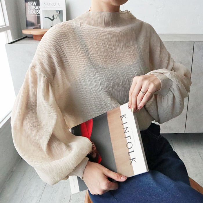 今季もトレンドのシアー素材の柔らかなプルオーバー。 たぷっとしたバルーン袖とネック・裾部分のメローがポイントとなり着るだけでこなれ感と女性らしさを演出。 キャミソールやサロペット等、様々なアイテムとレイヤードを楽しんでいただけます。