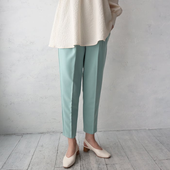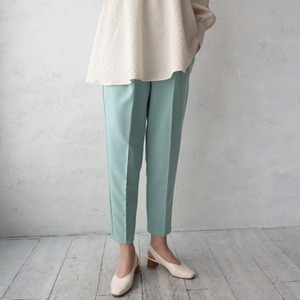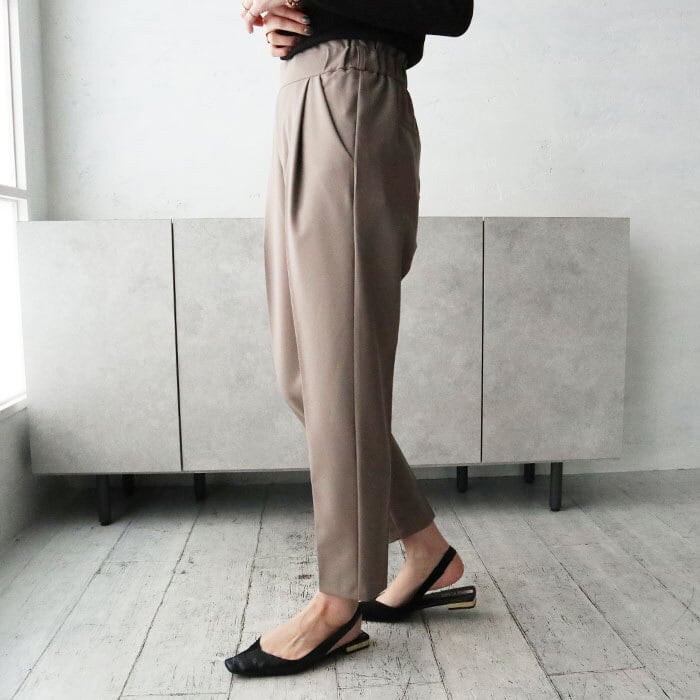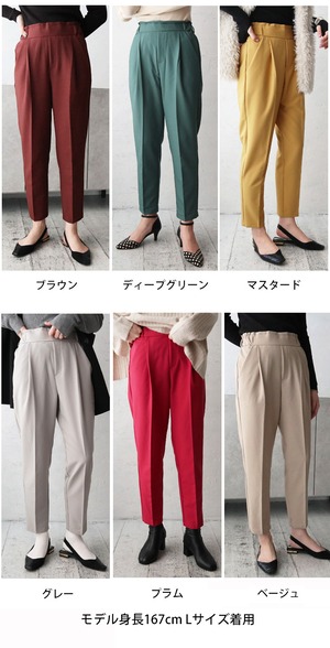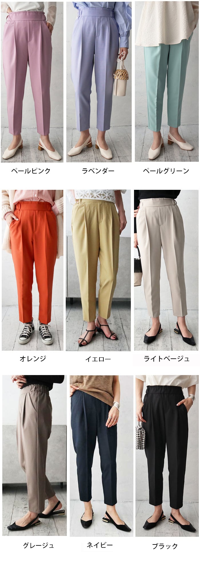 オールシーズン人気のタックテーパードパンツ。 スタンダードタイプで着回し力抜群の多数買い一押しアイテム。 オンオフ使えて大人カジュアルにもGOOD! ハイウエストタイプでスタイル良く見せてくれます。ヒップにフェイクポケットあり。 バックウエストはゴム仕様です。 裏地なし・伸縮性ややあり・透け感カラーによりややあり・ポケットあり。