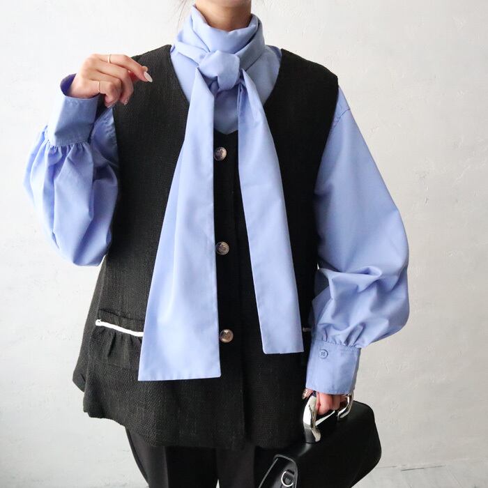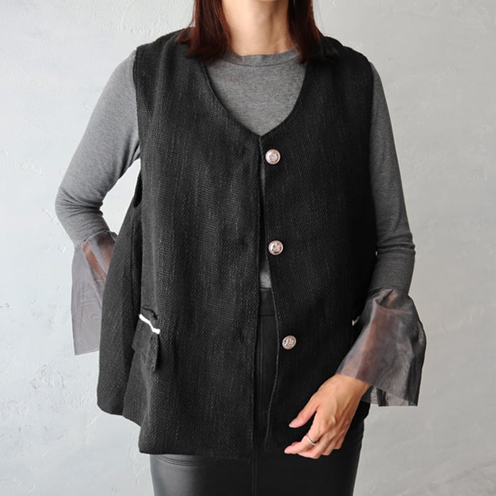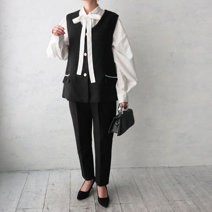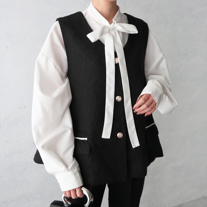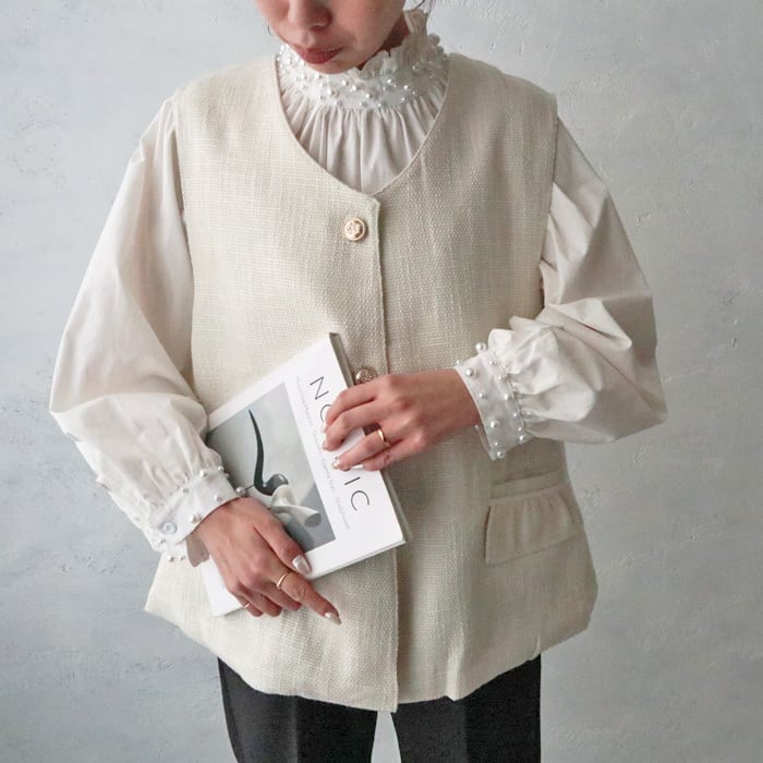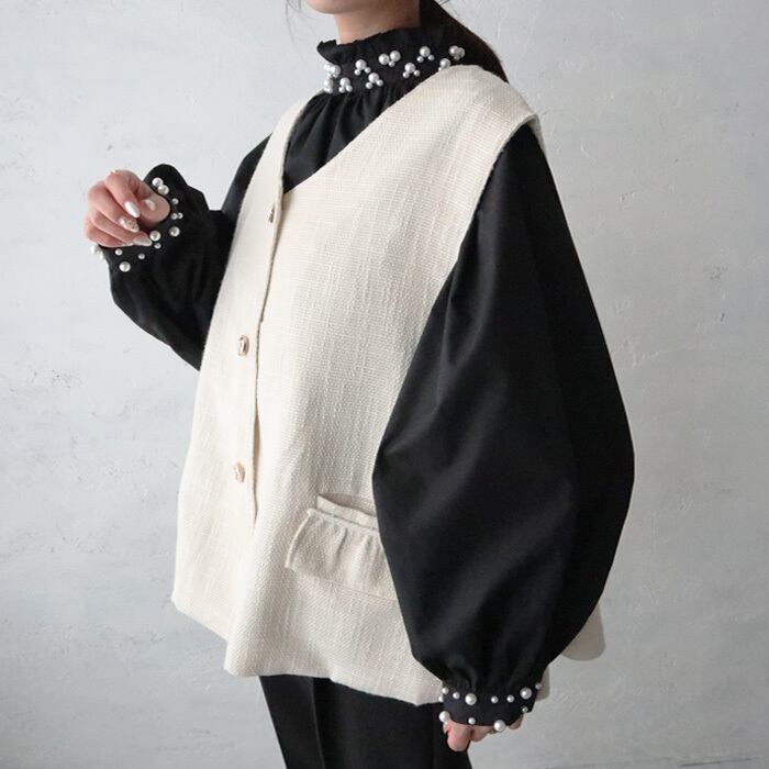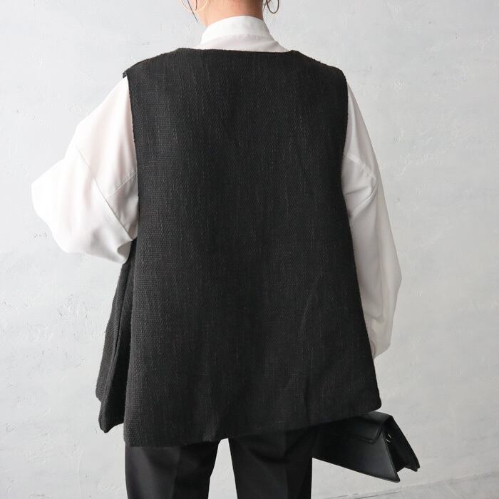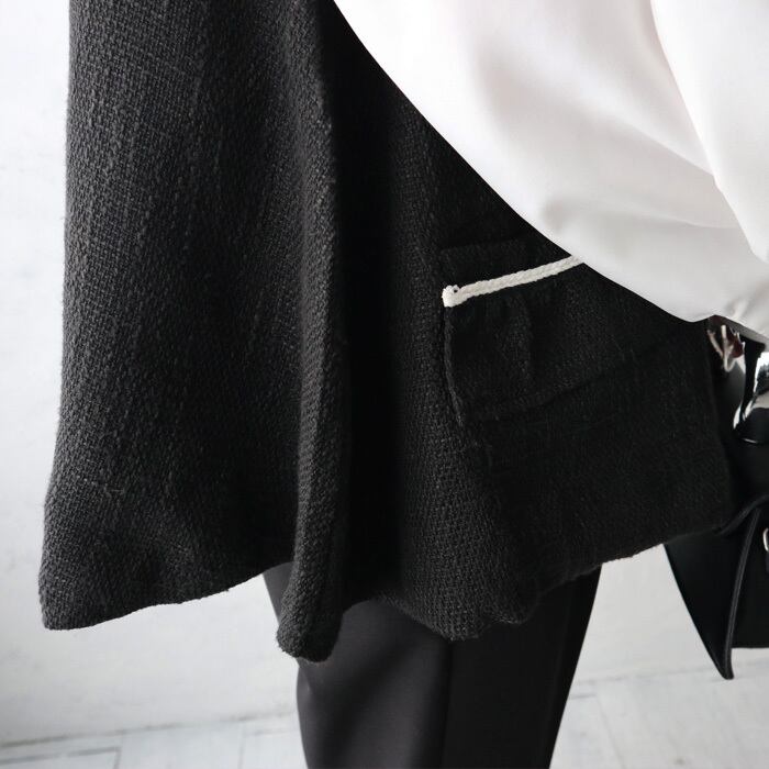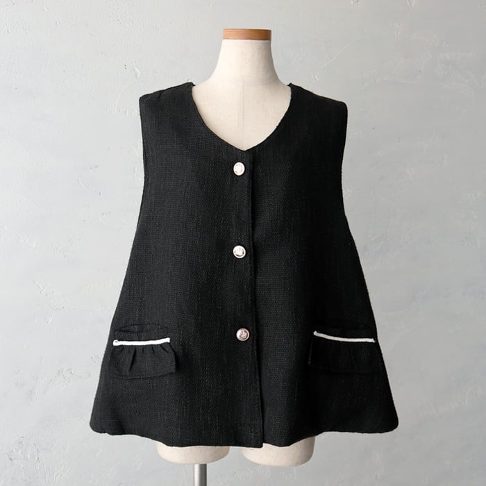 オケージョンシーンにもぴったりなツイード素材を使用したペプラムデザインのベスト。 ポケットに施されたパイピングがアクセントになり、シルエットにメリハリを与えます。 ふんわりAラインとゴールド釦もポイントになり上品さと可愛らしさを兼ね備えた1枚です。 1枚でもブラウスやタートルネックとのレイヤードスタイルにもぴったりで、ロングシーズン大活躍間違いなしのアイテムです。
