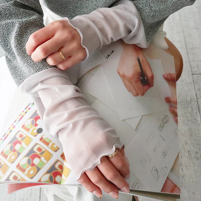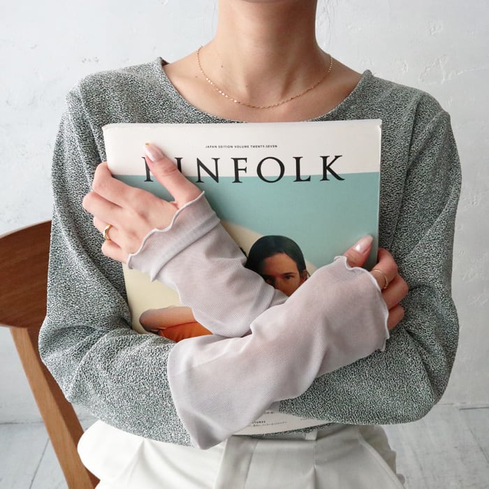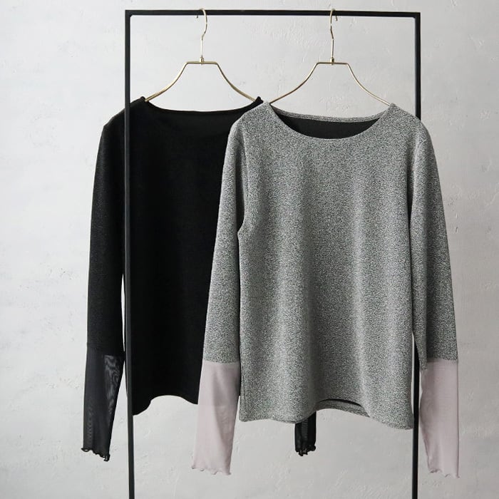 フリルシアーの切替がポイントになった女性らしいラメトップス。 ボディラインを拾い過ぎないシルエットなので、華奢見え効果も◎ やや長めのロングスリーブで、柔らかい肌触りと伸縮性もあり着心地抜群です。 1枚でもレイヤードでもサマになる万能アイテムです。